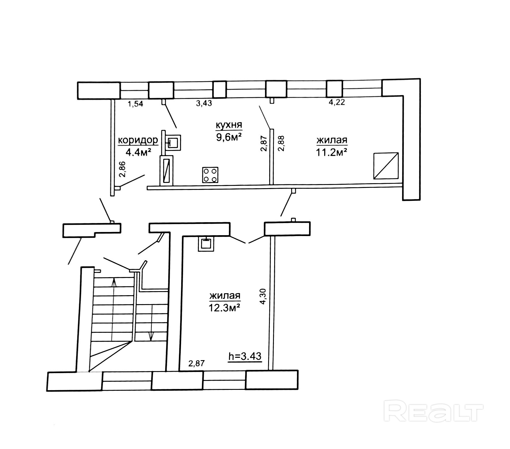 Квартира под ремонт, что позволит вам реализовать свой творческий потенциал. Потолки 3,43 м.