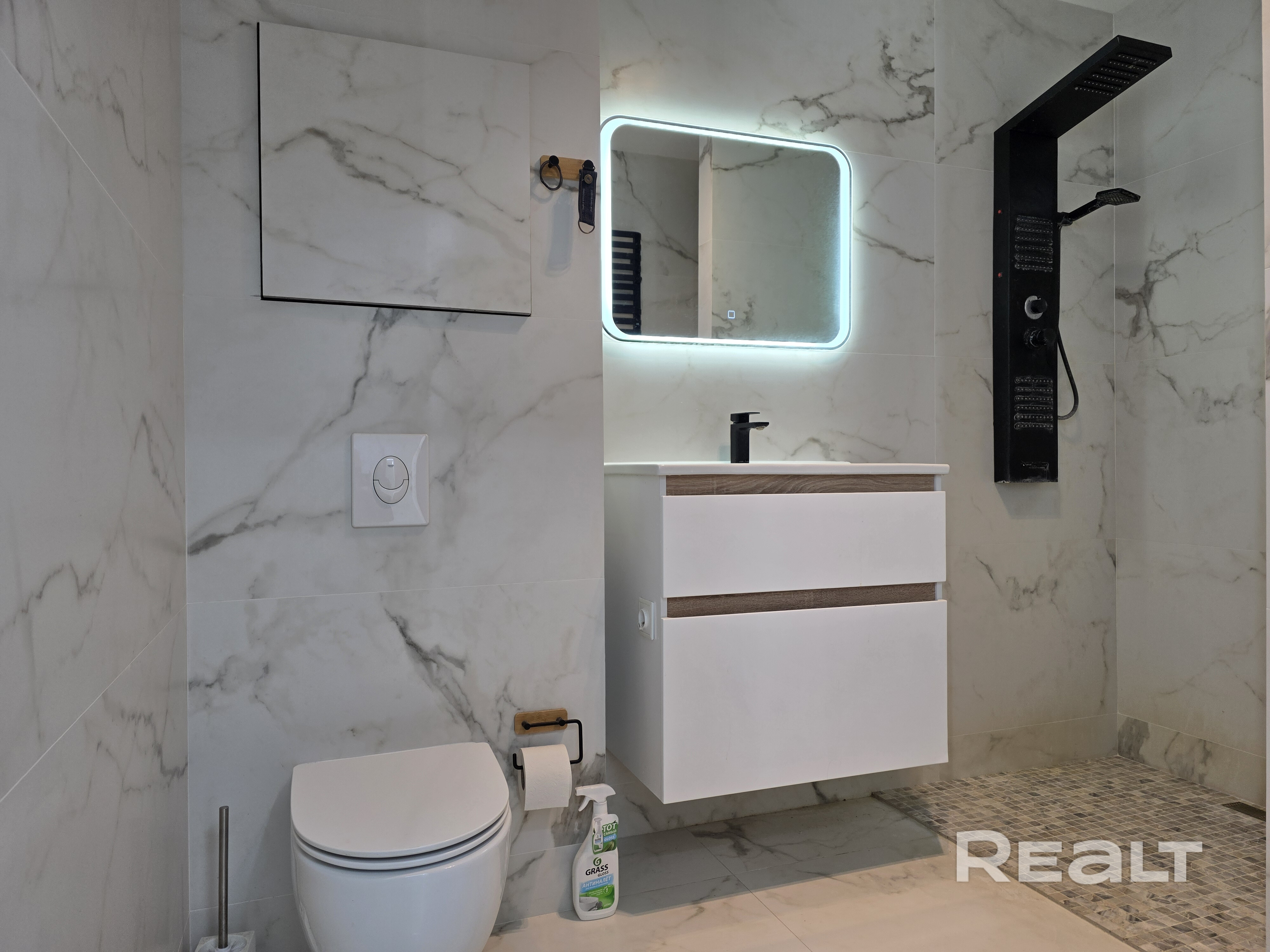 В ванной комнате выполнен качественный ремонт, есть вся необходимая сантехника.