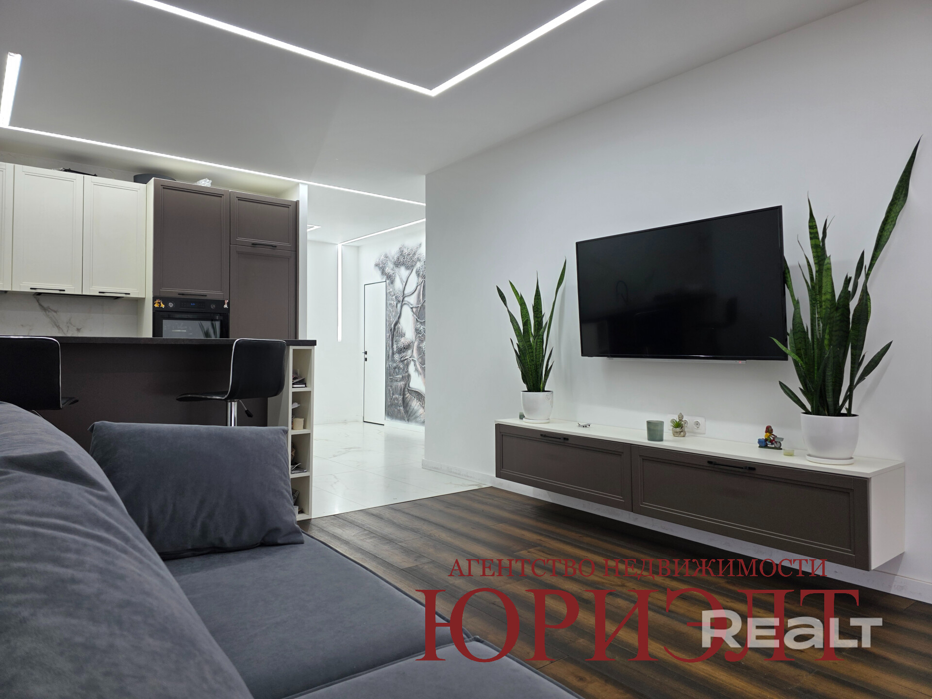 В самой квартире выполнен современный, качественный ремонт. Напольное покрытие квартиры состоит из плитки в коридоре, кухонной зоне и ванной комнате, в жилых зонах уложена паркетная доска. Потолок выполнен из гипсокартона, что придает экологичности квартире. Основным источником света являются световые линии. Квартира оборудована проходными выключателями, что позволяет управлять освещением из нескольких точек.