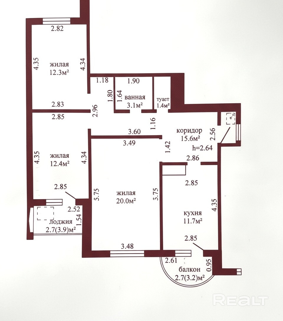 Общая площадь – 79,4 кв. м., жилая – 44,7 кв. м., кухня – 11,7 кв. м.