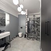 • Просторный совмещенный санузел: керамогранит, сантехника и смесители европейских производителей, теплый пол, стиральная машина.