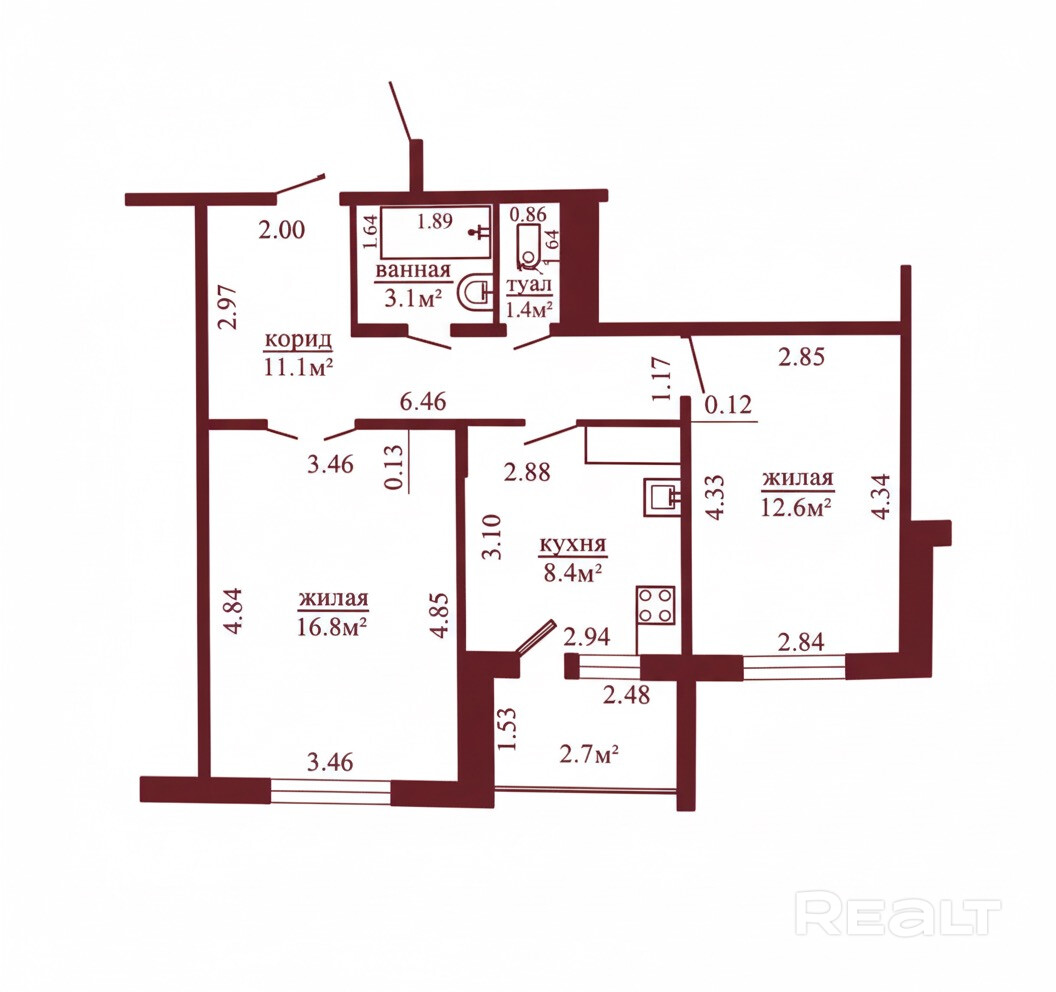 Общая площадь - 53,1 м2