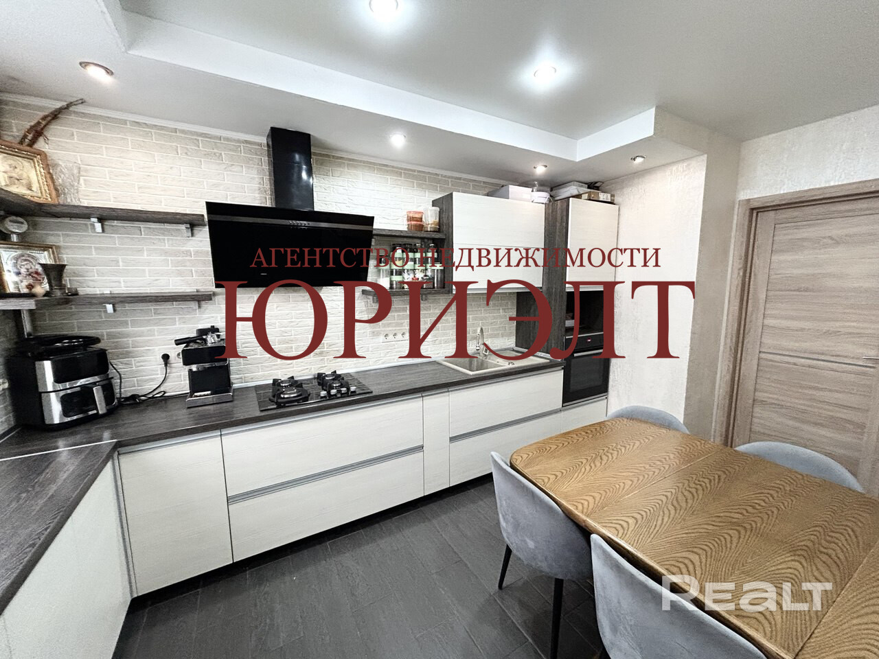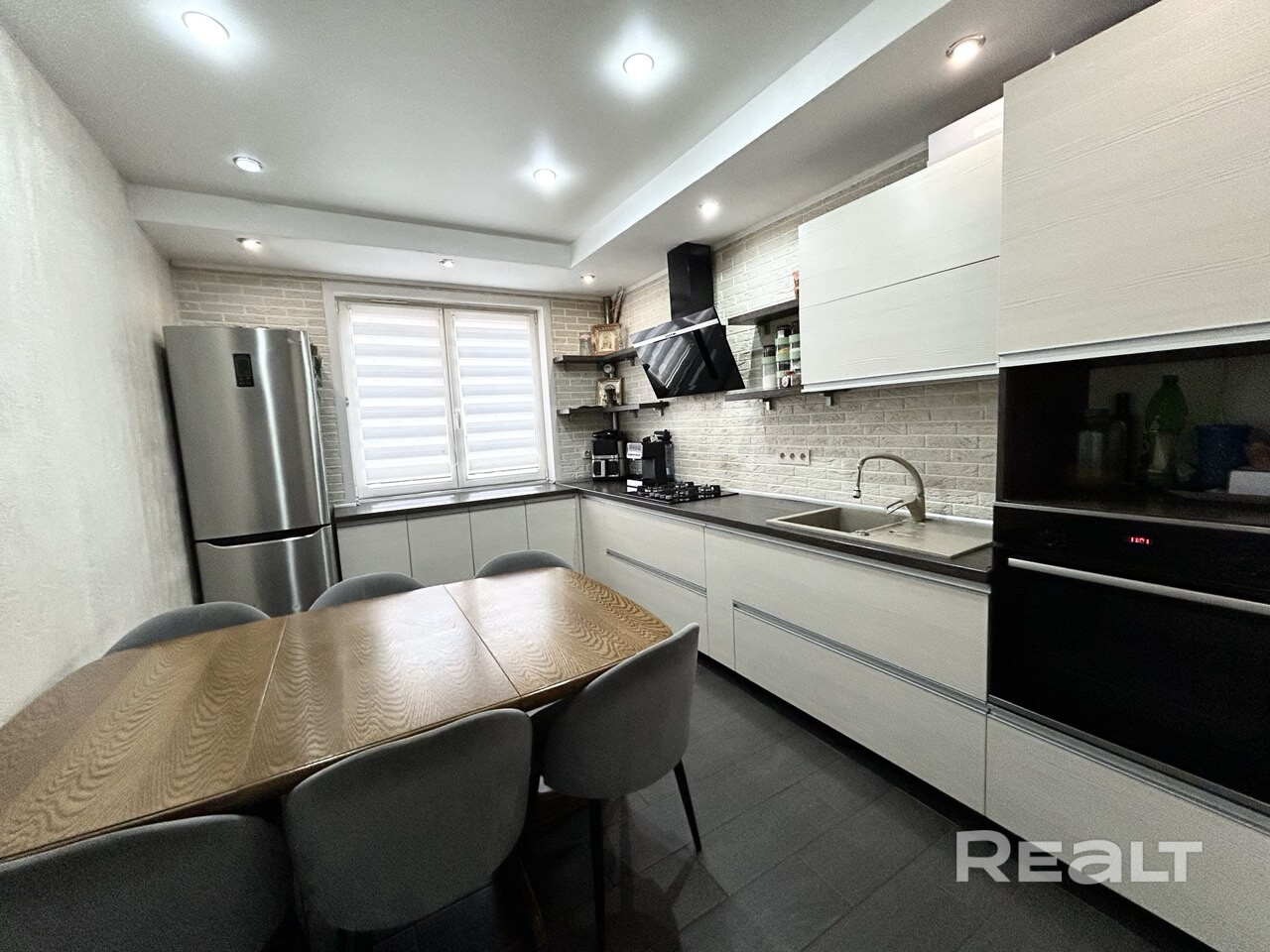 Просторная кухня оборудована варочной панелью, духовым шкафом и вытяжкой.