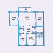 Общая площадь квартиры составляет 77,7 м.кв., в т.ч.: гостиная – 25,0 м.кв., три спальни — 11,5; 9,8 и 9,4 м.кв. соответственно и кухня — 8,1 м.кв.