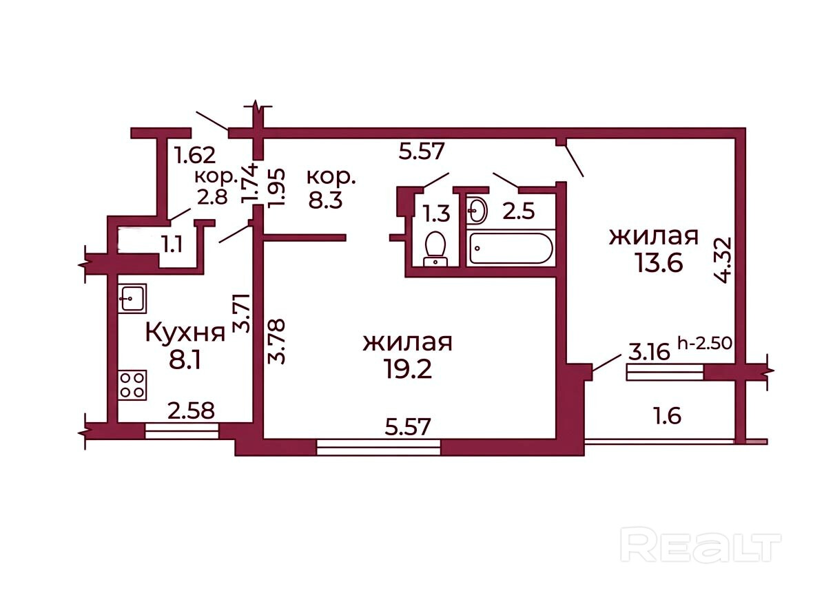 Общая площадь – 58,5 кв. м., жилая – 32,8 кв. м., кухня – 8,1 кв. м.