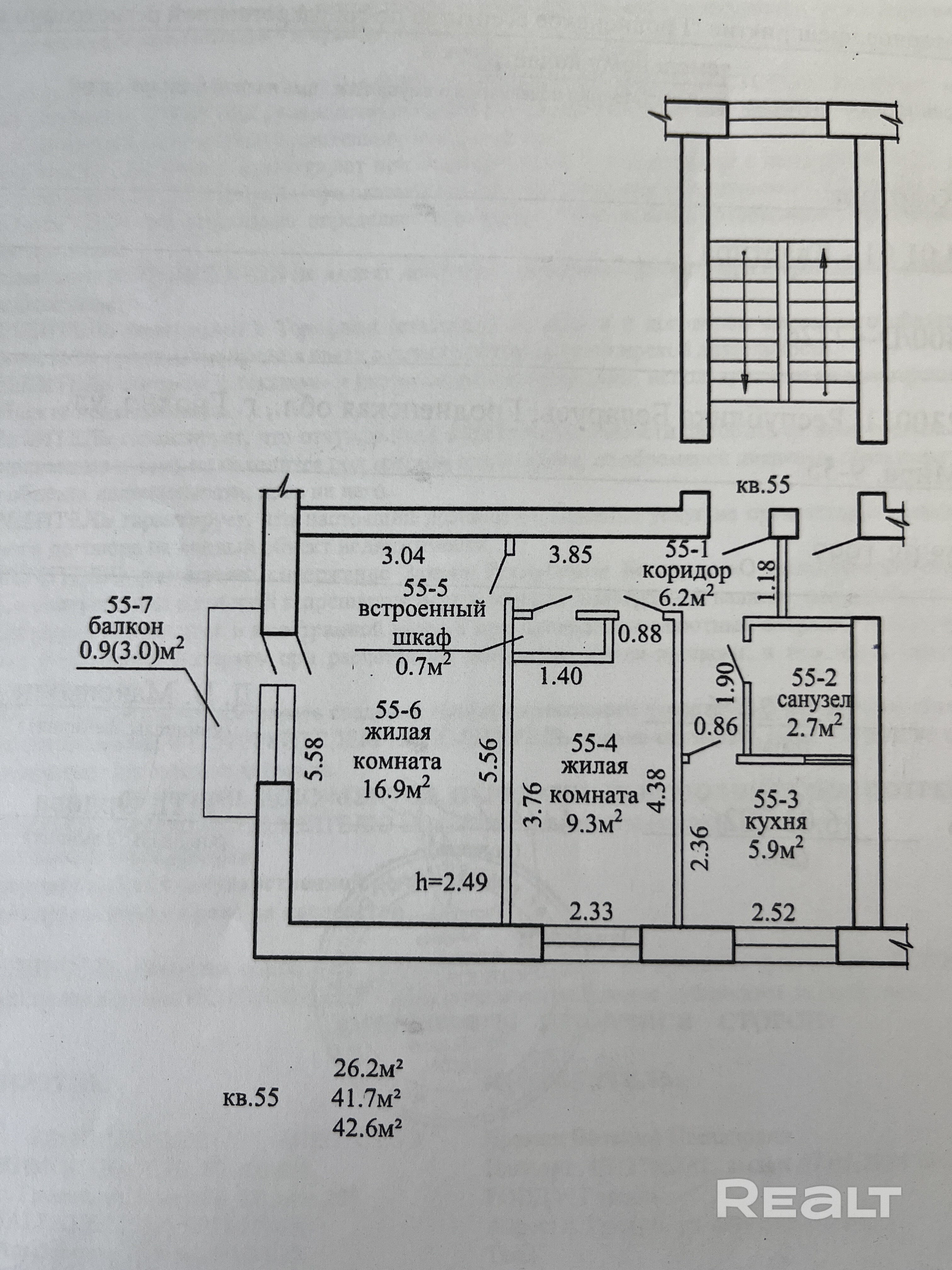 Общая площадь по СНБ 42,6 м2, жилая – 26,2 м2, кухня – 5,9, санузел совмещенный – 2,7. Комнаты не проходные!