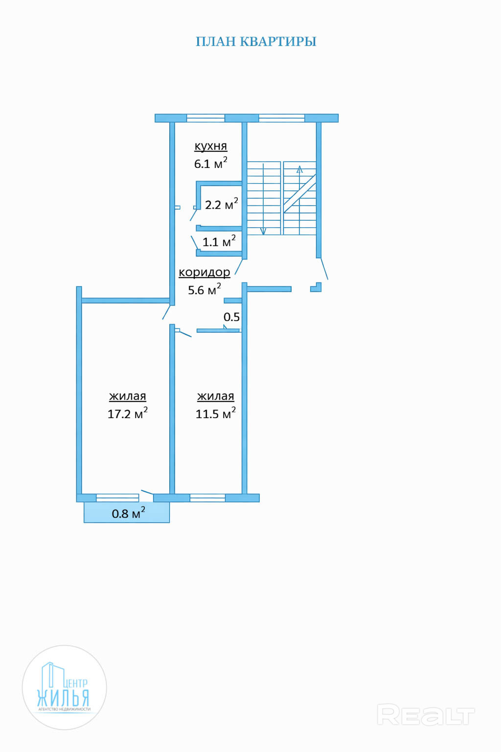 Площадь общая 45.0/ жилая 28.7 (комнаты 17.2 м2 и 11,5 м2), кухня 6.1 м2.