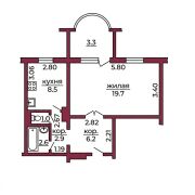 Общая площадь – 40,9 кв. м., жилая – 19,7 кв. м., кухня – 8,5 кв. м.