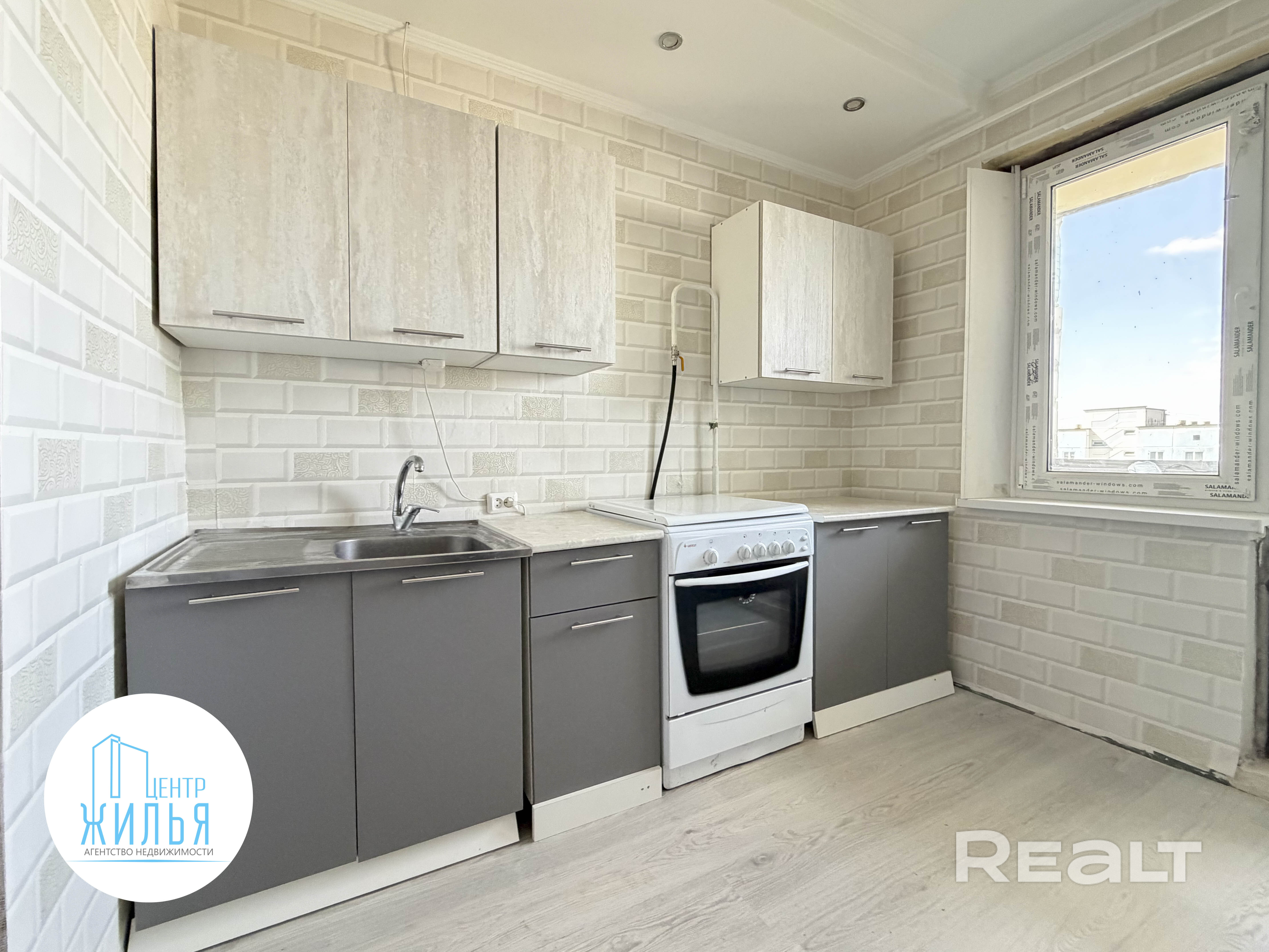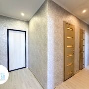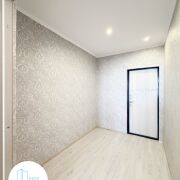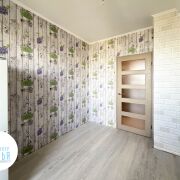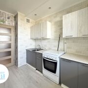 Во всех комнатах – стеклопакеты ПВХ, стены – обои, пол – ламинат, на кухне – линолеум, потолок – снежка (предусмотрено точечное освещение), сан.узел (раздельный) – плитка, входная металлическая дверь. Есть лоджия.