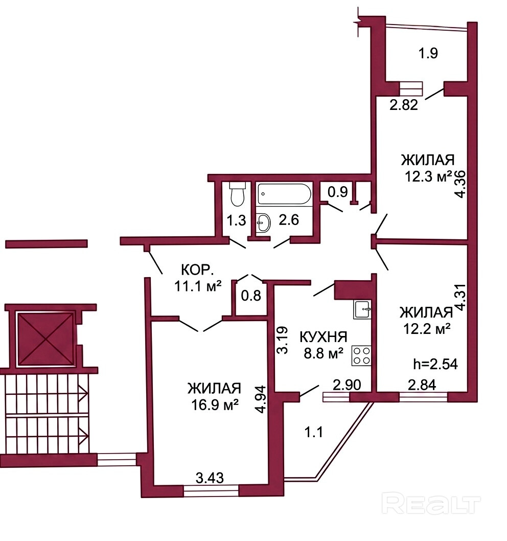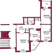 Гостиная 16,9 м2 и две комнаты 12,3м2 и 12,2 м2
