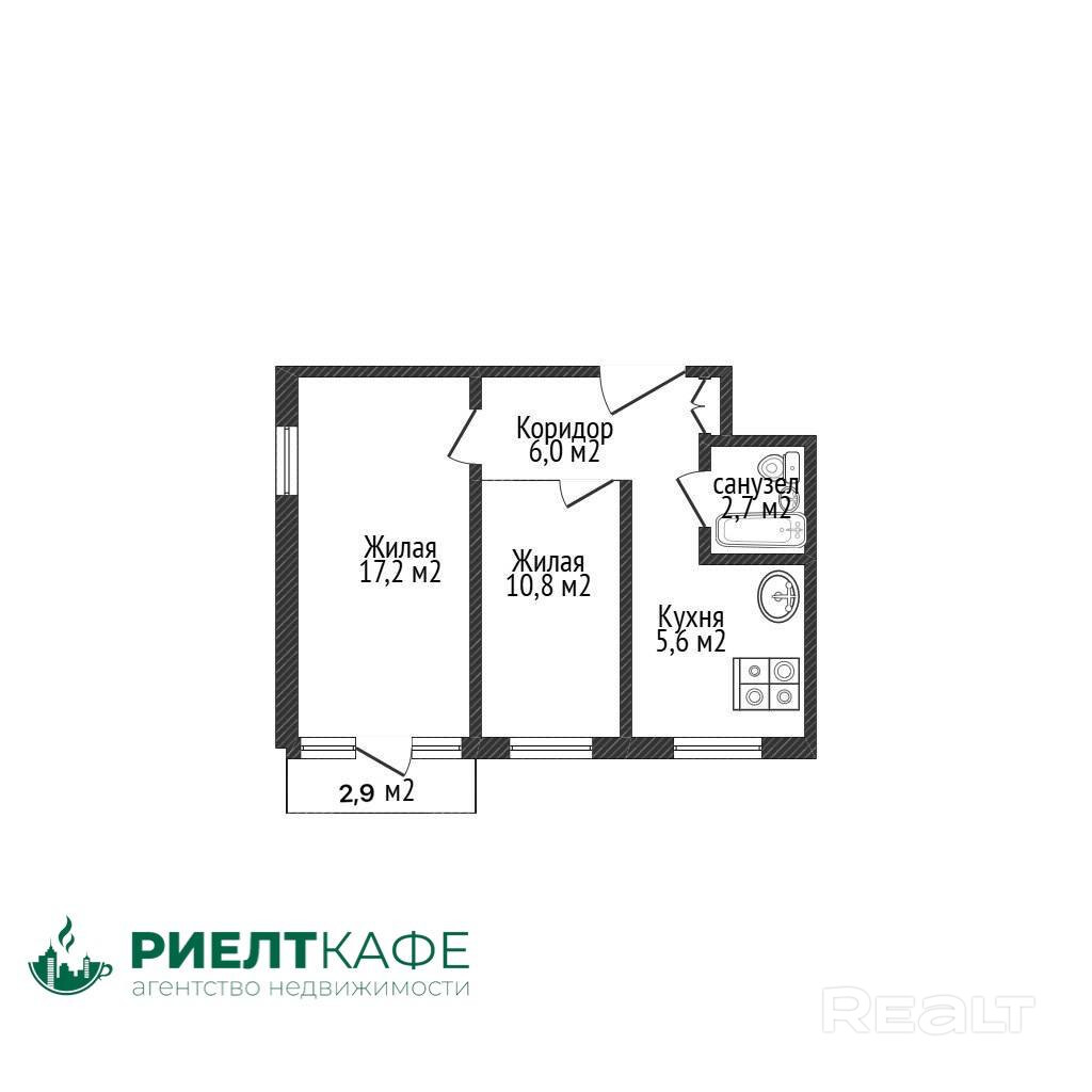 Общая площадь- 42,5 кв.м., изолированные комнаты – 17,2 кв.м. и 10,8 кв.м., кухня - 5,6 кв.м., совмещенный санузел - 2,7 кв.м. В спальне оборудован шкаф-гардеробная. Установлены стеклопакеты. Светлая и уютная квартира.