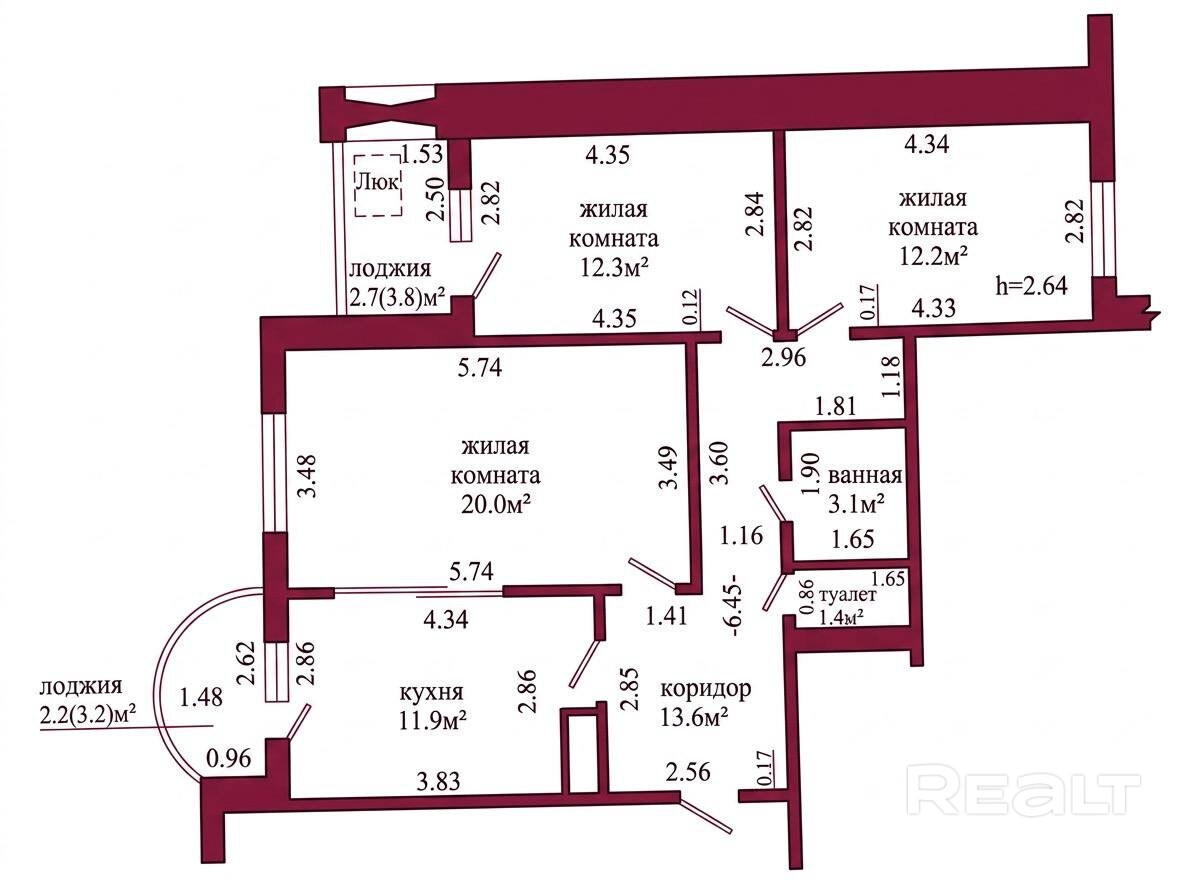 Общая площадь по СНБ - 79,4 кв.м., общая площадь – 74,5 кв. м., жилая – 44,5 кв. м., кухня – 11,9 кв. м. Высота потолка 2.64м.