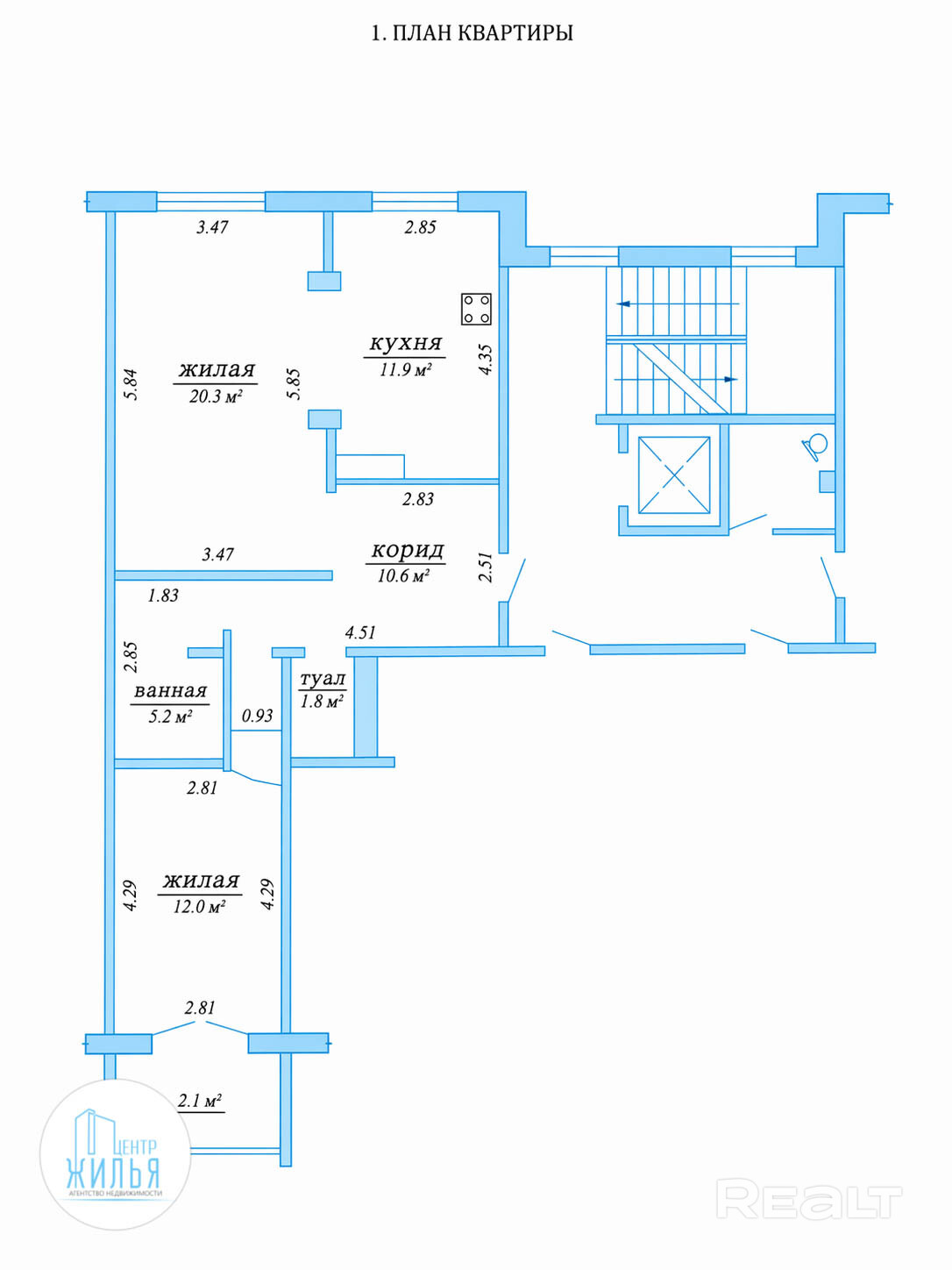 Общая площадь квартиры по СНБ — 63.9 м.кв., жилая — 32.3 м.кв., кухня- 11.9 метров.