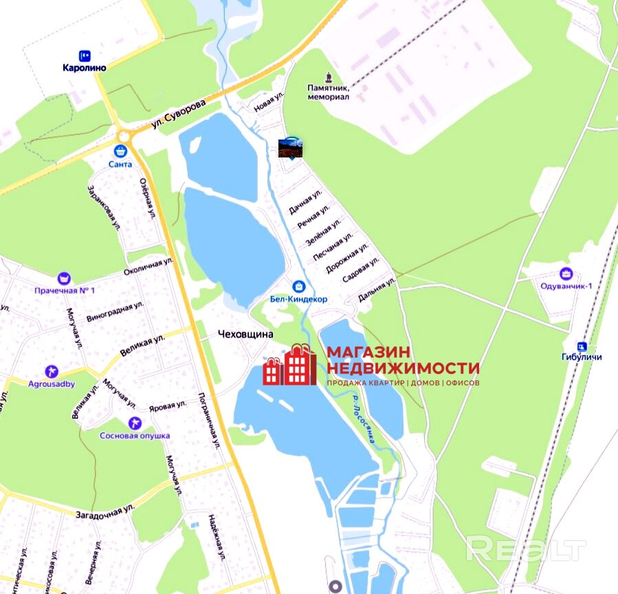 Находится в СТ «Чеховщина», Коптёвский с/c, направление д.Коробчицы (микрорайон Колбасино). Постоянно ходит городской автобус.(400 м до остановки.) Удобные подъездные пути. В 100 метрах находится река Лососянка и живописный сосновый лес. В шаговой доступности озеро Юбилейное, маёнтак Коробчицы, Каралинский фальварок, несколько водохранилищ.