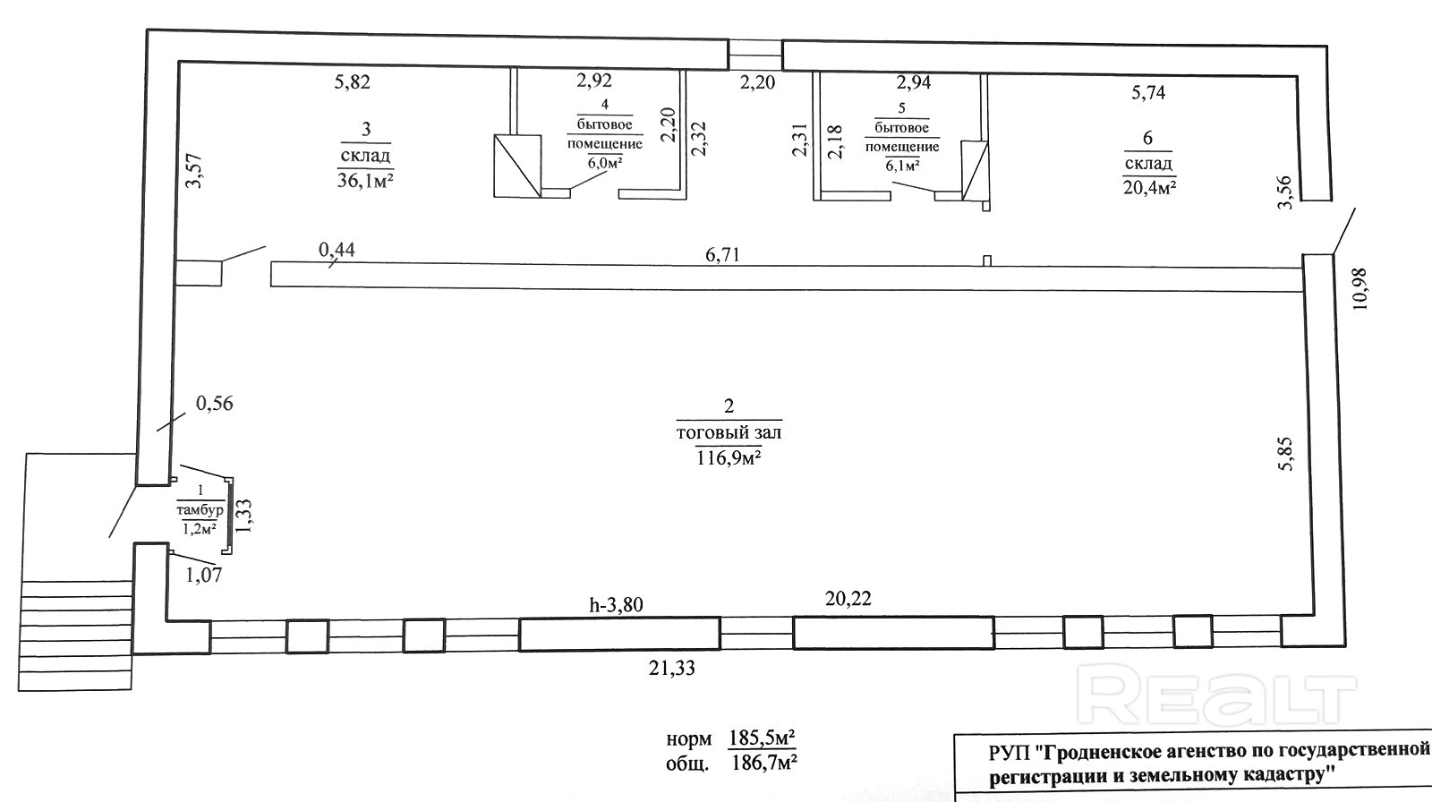 Кирпичное строение площадью 186.7 м2, нормируемая 185.5 м2 .
