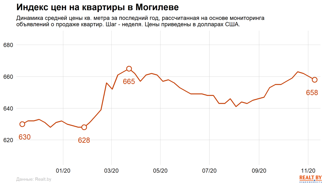 Средняя цена в объявлениях о продаже квартир в Могилеве снизилась на 0.3% и составила 658 $/м2.