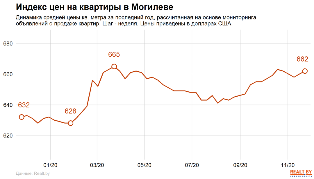 Средняя цена в объявлениях о продаже квартир в Могилеве выросла на 0.3% и составила 662 $/м2.