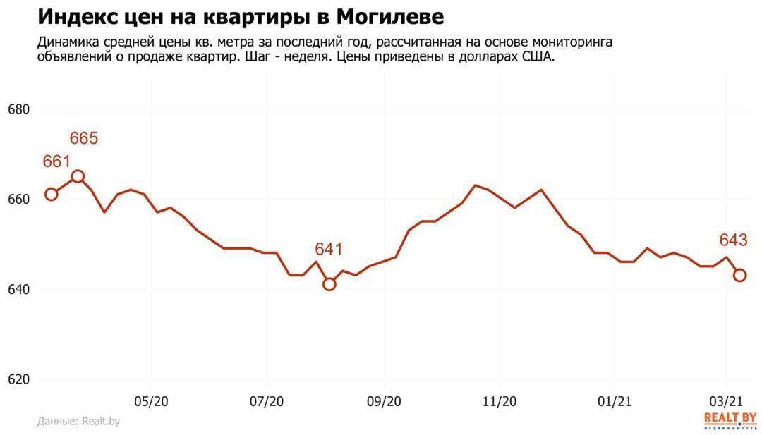 Средняя цена в объявлениях о продаже квартир в Могилеве снизилась на 0.6% и составила 643 $/м2.