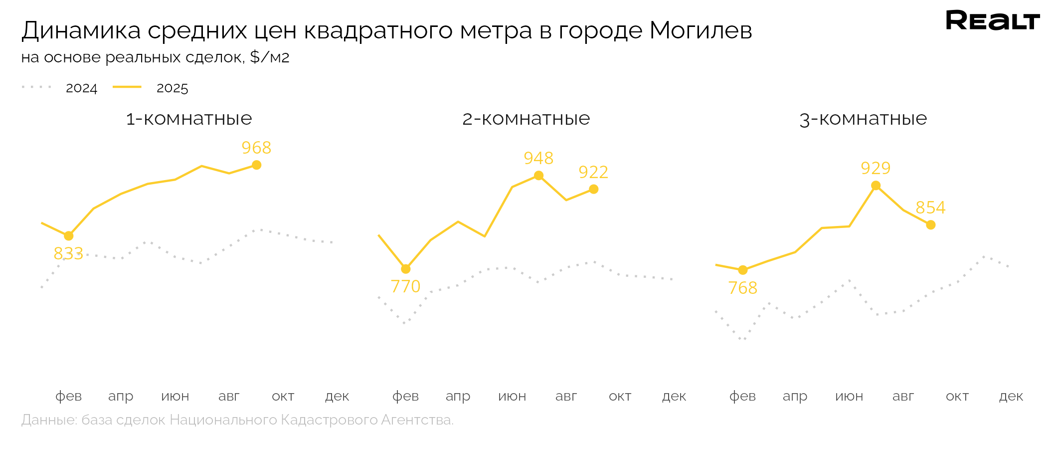 По данным сделок средняя цена квадратного метра 1-комнатных квартир, которые на данный момент продаются в среднем по 968 $/м2, увеличилась на 1.7%. Средняя стоимость 2-комнатных квартир в Могилеве составляет 922 $/м2 (+2.3% за месяц). 3-комнатные квартиры продавали в среднем за 854 $/м2 (-3.2% за месяц).