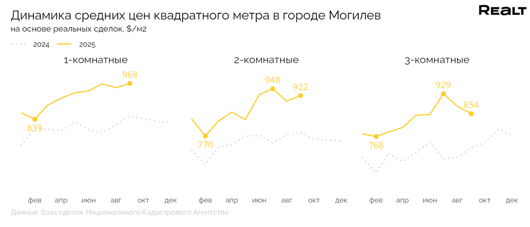По данным сделок средняя цена квадратного метра 1-комнатных квартир, которые на данный момент продаются в среднем по 968 $/м2, увеличилась на 1.7%. Средняя стоимость 2-комнатных квартир в Могилеве составляет 922 $/м2 (+2.3% за месяц). 3-комнатные квартиры продавали в среднем за 854 $/м2 (-3.2% за месяц).