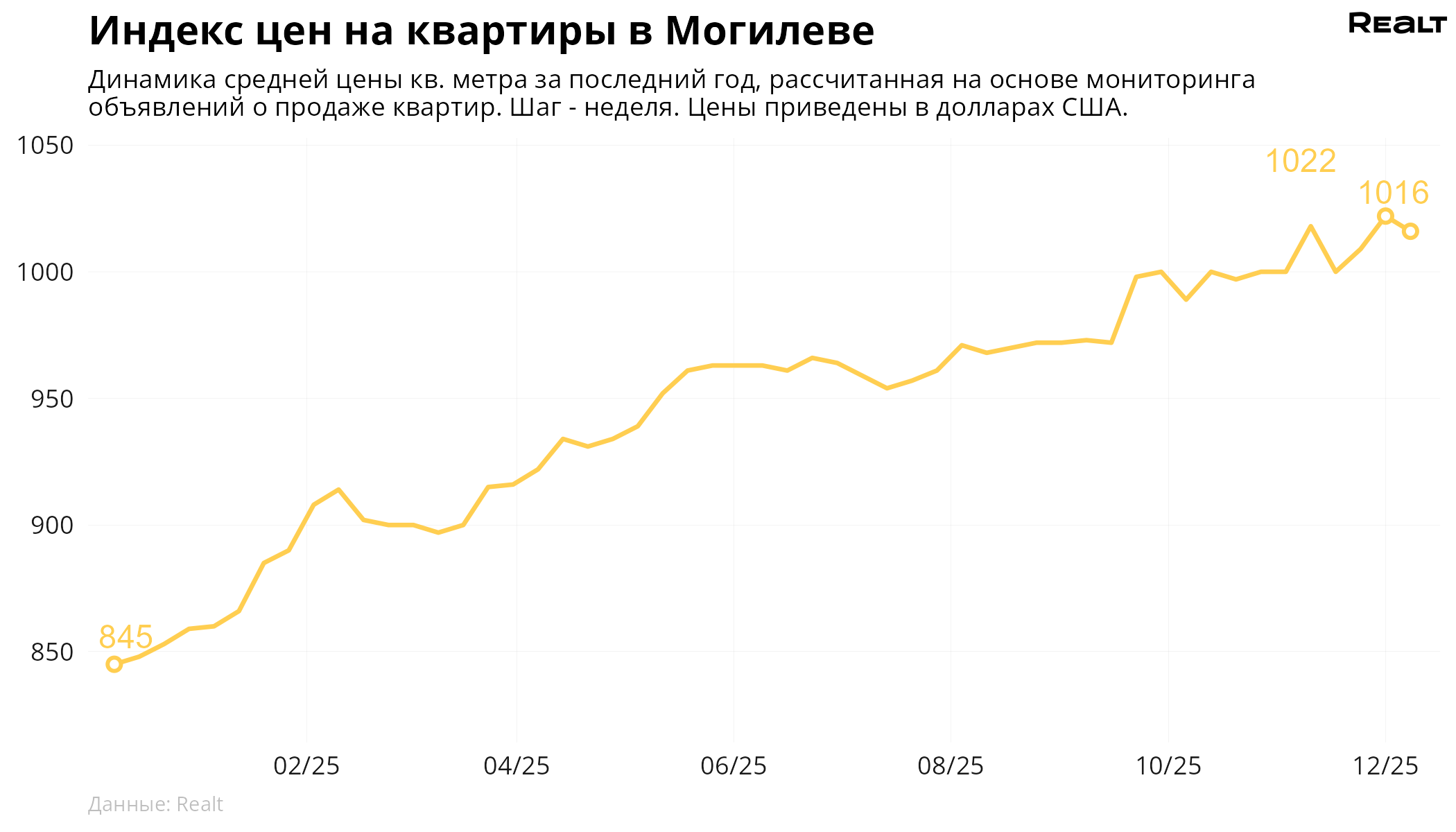 118За неделю, с 1 по 8 декабря 2025 года, средняя цена в объявлениях о продаже квартир в Могилеве снизилась на 0.6% и составила 1016 $/м2. При этом количество квартир в продаже увеличилось на 2.7%. Что еще произошло на рынке жилья крупнейших городов Могилевской области за семь дней — в материале.