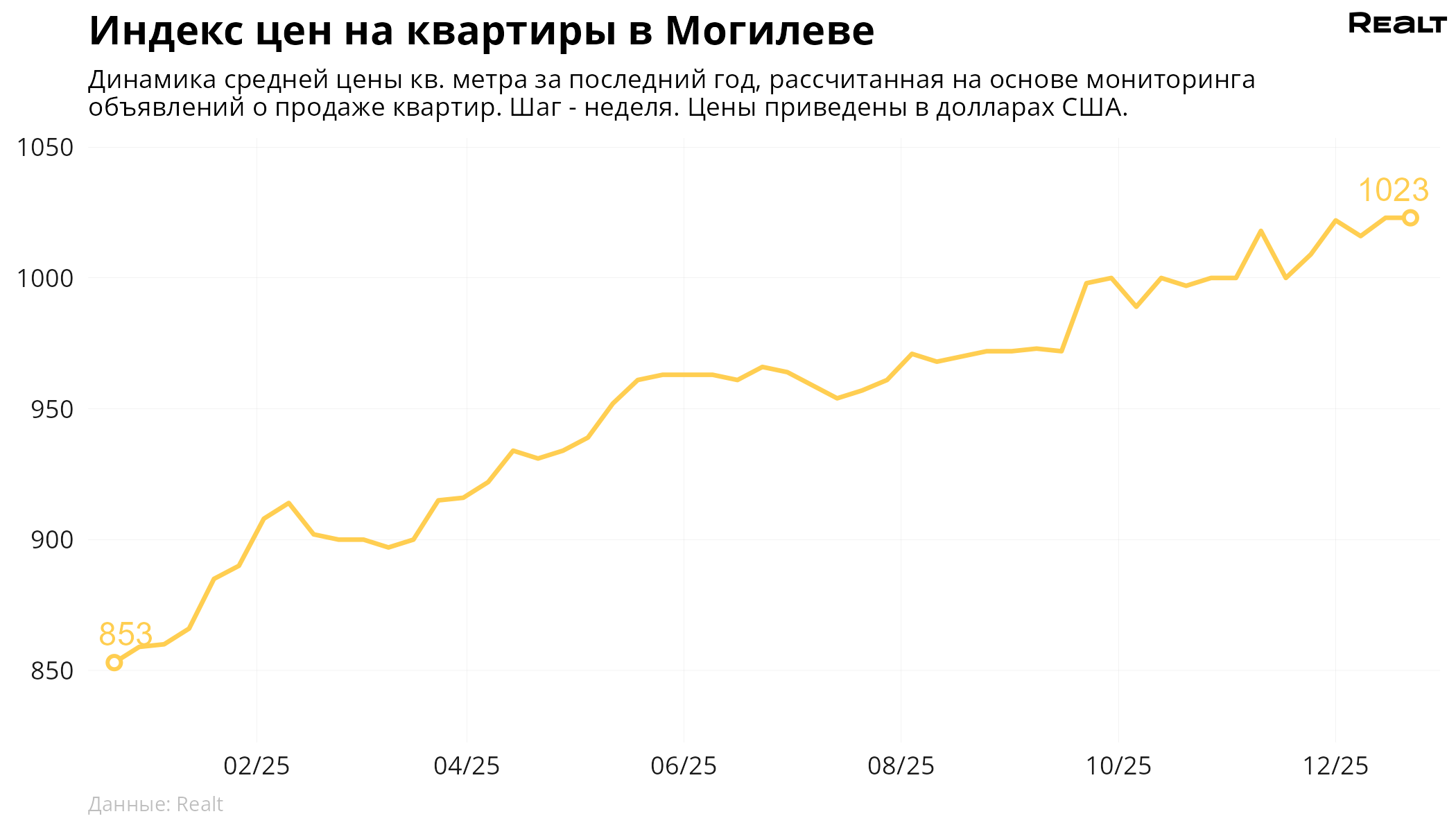98За неделю, с 15 по 22 декабря 2025 года, средняя цена в объявлениях о продаже квартир в Могилеве не изменилась и составила 1023 $/м2. При этом количество квартир в продаже уменьшилось на 1.1%. Что еще произошло на рынке жилья крупнейших городов Могилевской области за семь дней — в материале.