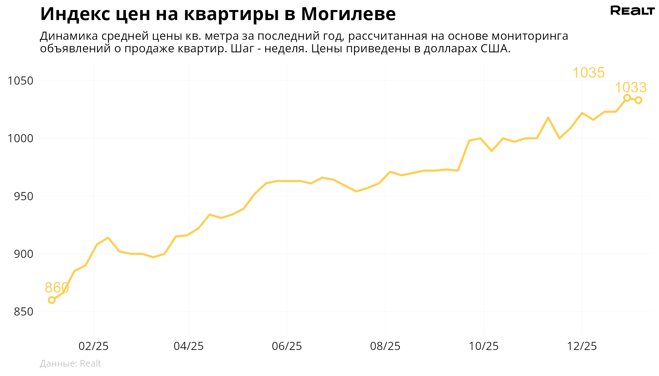 196За неделю, c 29 декабря по 5 января 2026 года, средняя цена в объявлениях о продаже квартир в Могилеве снизилась на 0.2% и составила 1033 $/м2. При этом количество квартир в продаже уменьшилось на 4.5%. Что еще произошло на рынке жилья крупнейших городов Могилевской области за семь дней — в материале.