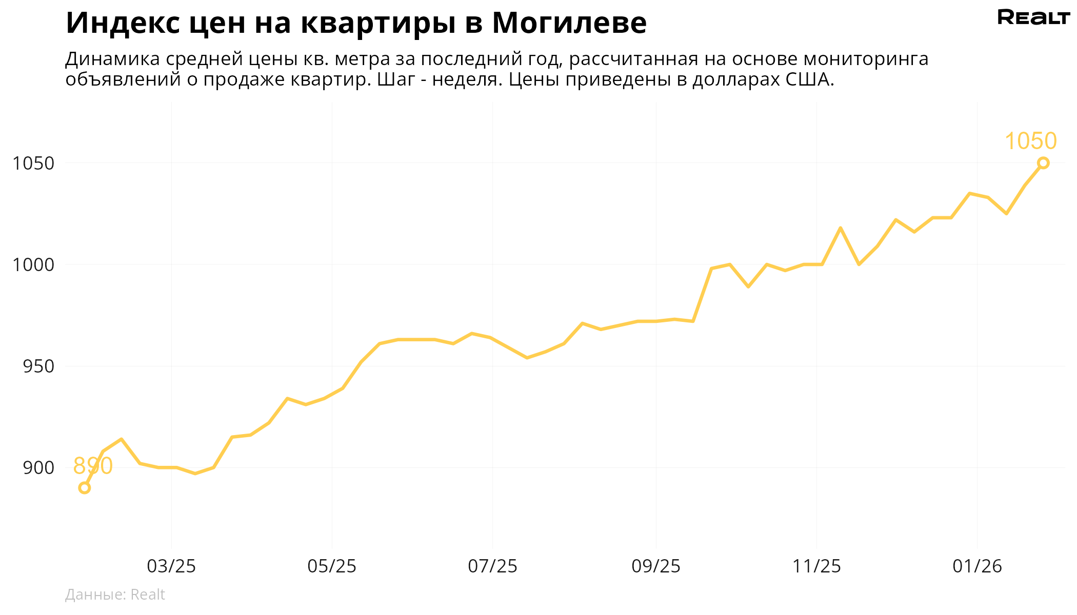 218За неделю, с 19 по 26 января 2026 года, средняя цена в объявлениях о продаже квартир в Могилеве выросла на 1.1% и составила 1050 $/м2. При этом количество квартир в продаже уменьшилось на 0.4%. Что еще произошло на рынке жилья крупнейших городов Могилевской области за семь дней — в материале.