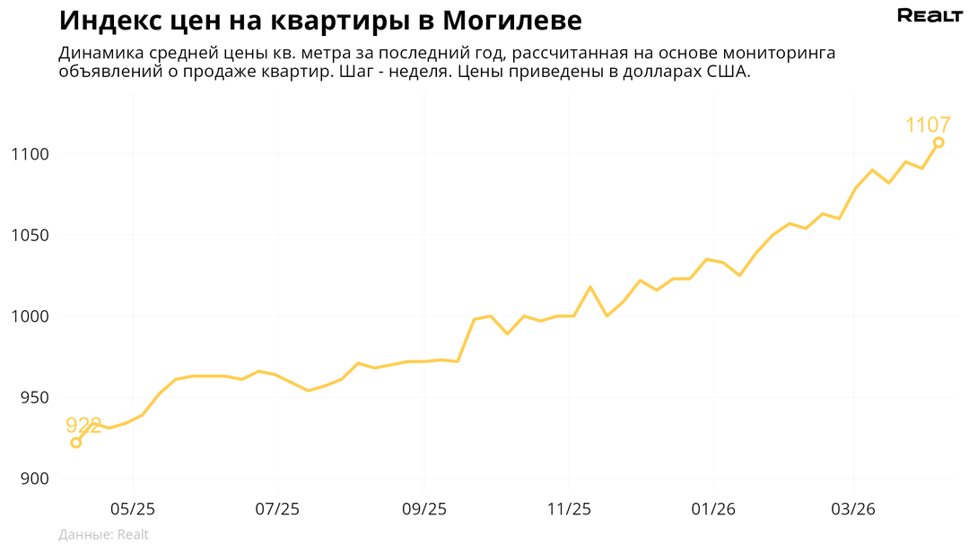 139За неделю, c 30 марта по 6 апреля 2026 года, средняя цена в объявлениях о продаже квартир в Могилеве выросла на 1.5% и составила 1107 $/м2. При этом количество квартир в продаже увеличилось на 3.9%. Что еще произошло на рынке жилья крупнейших городов Могилевской области за семь дней — в материале.