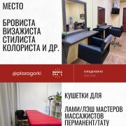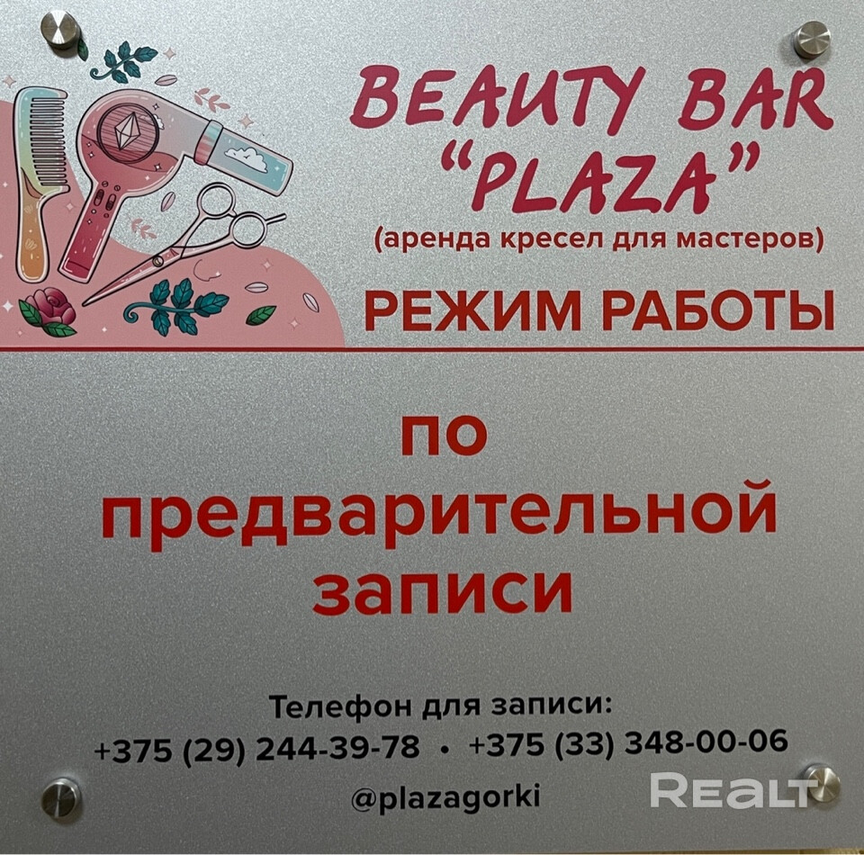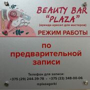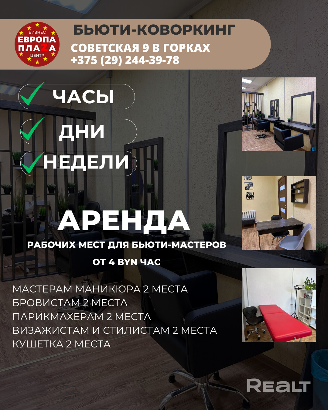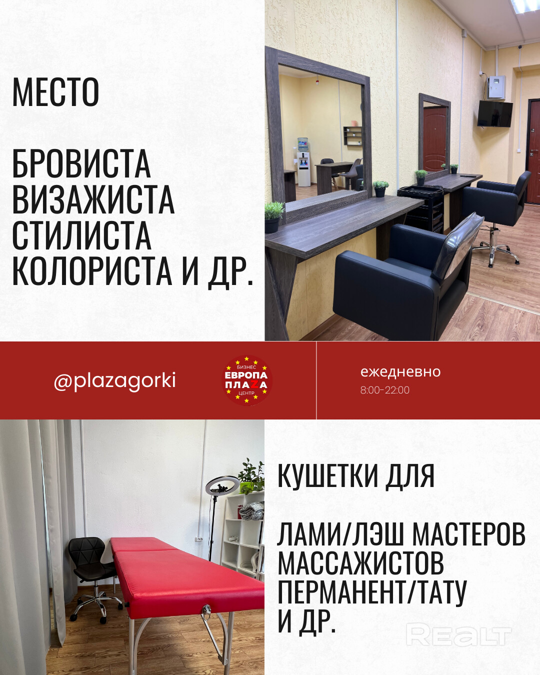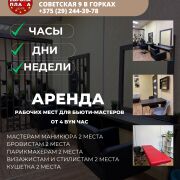 Сдаются в аренду места для бьюти мастеров на часы, дни, месяцы и на постоянной основе целиком все помещения (при необходимости) полностью оборудованное пространство Бьюти-Бар в Бизнес центре Плаза расположенное в самом центре города Горки, ул. Советская д.9. Имеются оборудованные места: 2 места для маникюра, 1 место для педикюра, 2 кушетки в отдельном помещении, 2 места для парикмахеров. В помещении оборудована зона для клиентов, ТВ, кулер, вай фай. В здании находятся круглосуточный магазин.