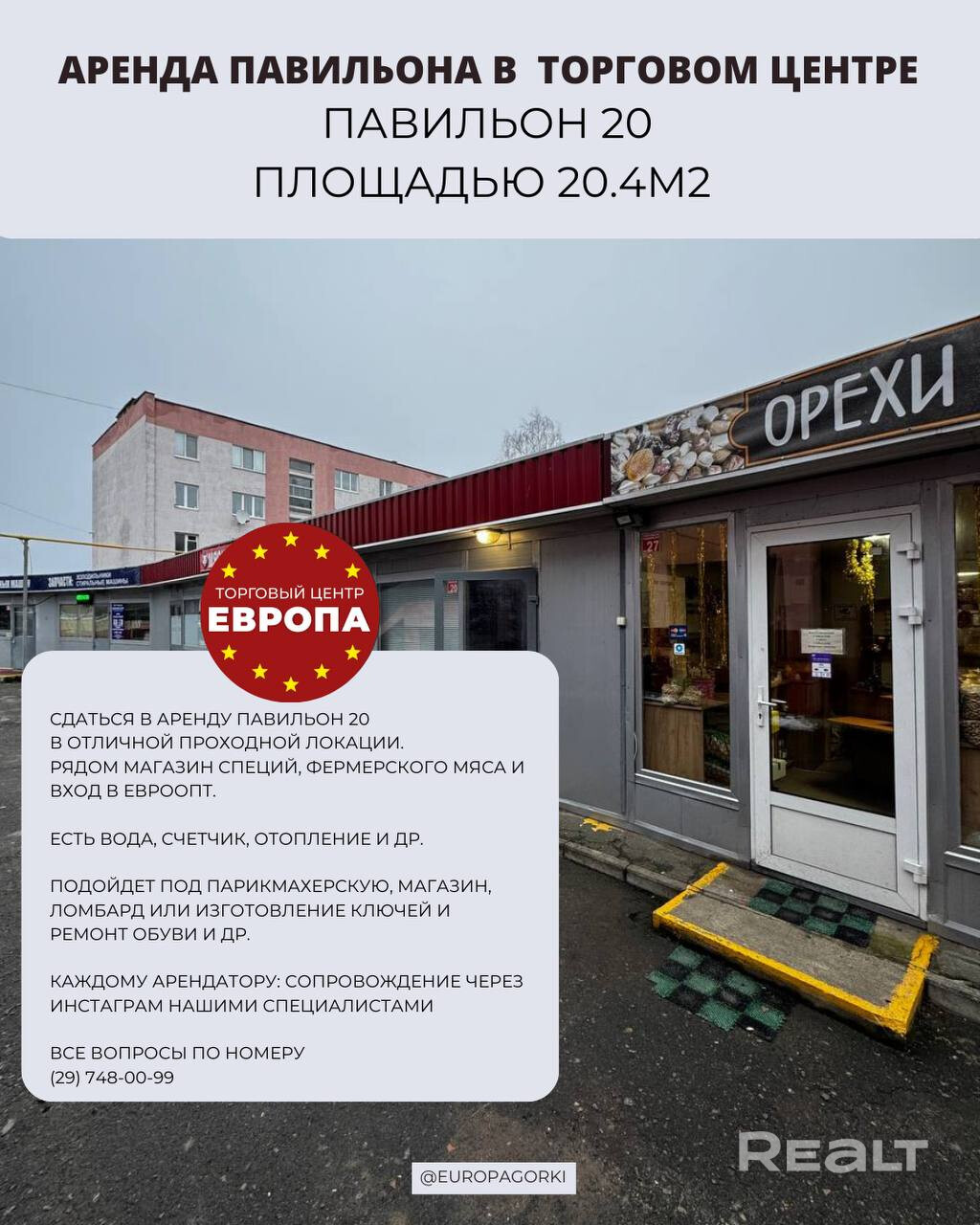 Торговые павильоны номер 20 Площадью 20-50 м2 , с водой, отоплением, счетчик, отдельный круглосуточный вход, подъезд для грузовиков, парковка, сигнализация и др. Продвижение в соцсетях и реклама за наш счет! Расположен между магазином Фермерское мясо и специи. Рядом вход в самый большой "Евроопт" в Горках *50% скидка на первый месяц аренды Все с ремонтом под ключ.