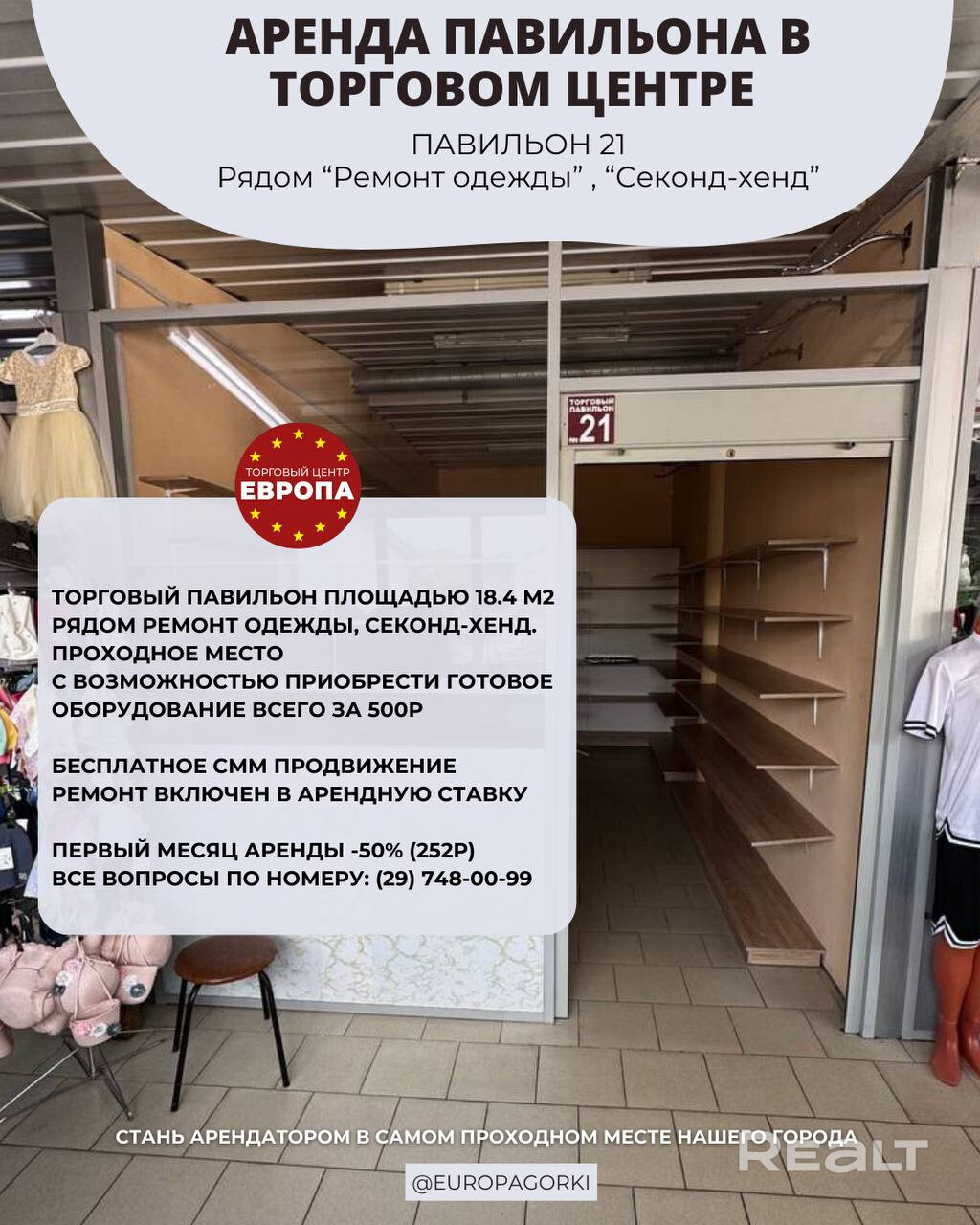 Сдаются в аренду торговый павильон площадью от 5 до 250 метров квадратных в торговом комплексе ТЦ «Малая Европа». Помещения полностью готовы для арендатора. На первом этаже расположен самый большой магазин «Евроопт» в городе, а на территории торгового комплекса расположено более 85 торговых объектов. Рассмотри различные варианты сотрудничества как с индивидуальными предпринимателями, так и с крупными ритейлерами. Первый месяц скидка 50% на аренду. Набирайте и договоримся!