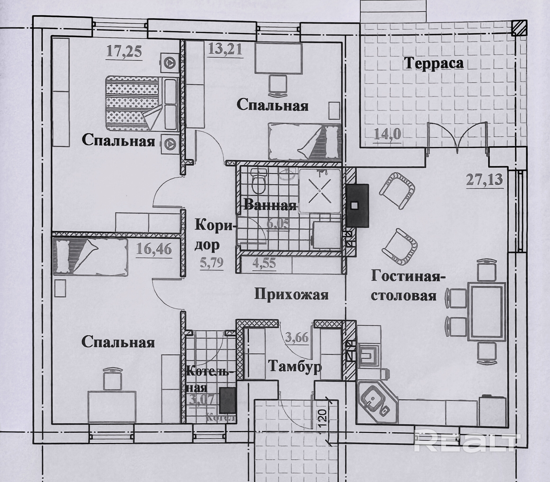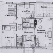 Высота потолков — 2,7 м. К дому предусмотрена терраса площадью 14 м2.