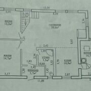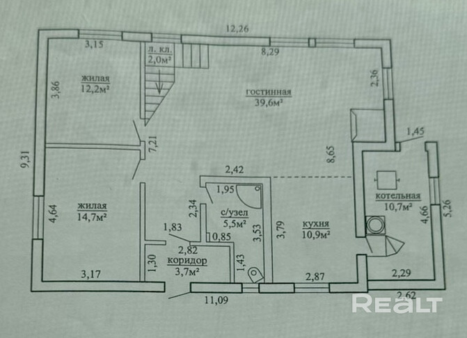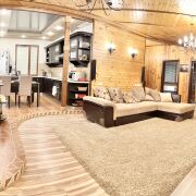На первом этаже: 2 отдельных комнаты (12 и 15 кв.м), санузел (5,5 кв.м), гостинная и кухня (50,5 кв.м.), котельная (10,7 кв.м).
