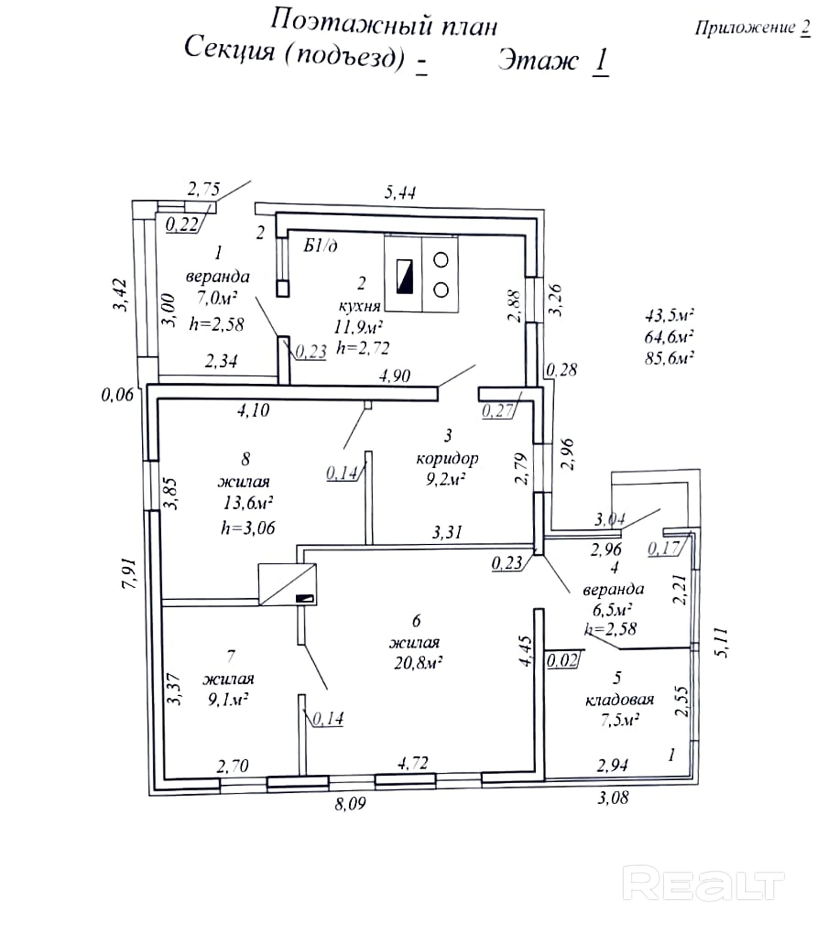Общая площадь дома 64.6 кв.м. (по СНБ 85.6 кв.м.), жилая площадь 43.5 кв.м. и кухня 11.9 кв.м.