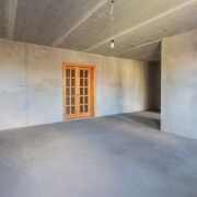 Наружные стены — кирпич, воздушное пространство, затем блоки — эффект термоса. Внутренние стены поштукатурены, полы — пенопласт и стяжка. Крыша — шифер, тройные стеклопакеты, входная дверь металлическая, межкомнатные двери деревянные. Сделана разводка электрики и сантехники.