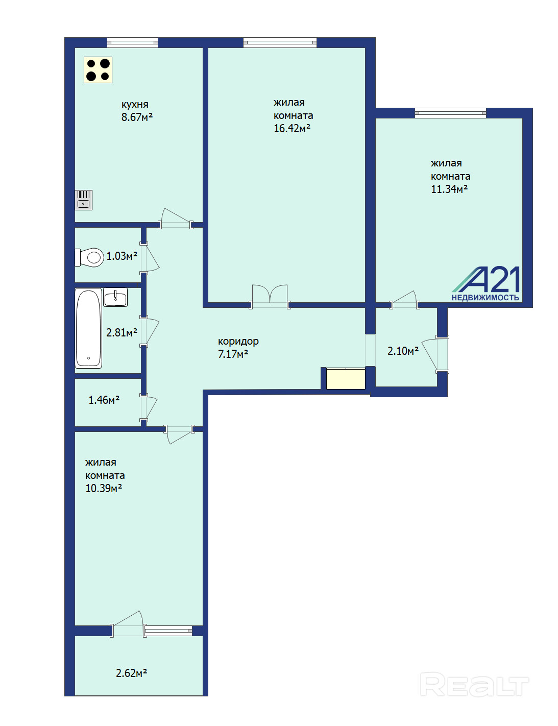 4 этаж девятиэтажного дома. Общая площадь - 61, 79 кв. м. Жилая - 38,15 кв. м, Кухня 8,67 кв. м.
