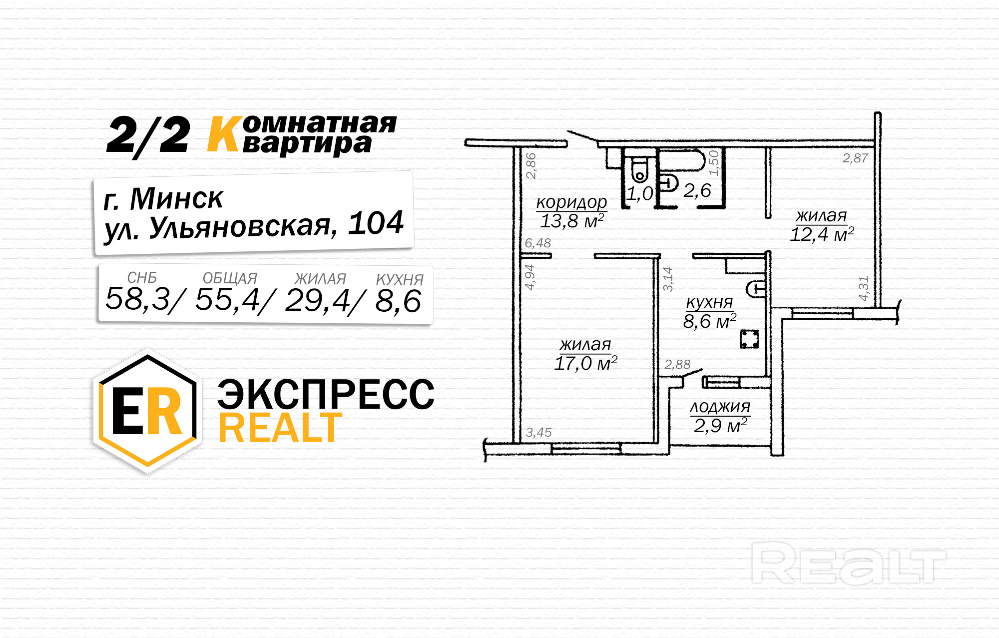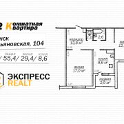 - Общая площадь: 55,4 кв.м. (по СНБ — 58,3 кв.м.).