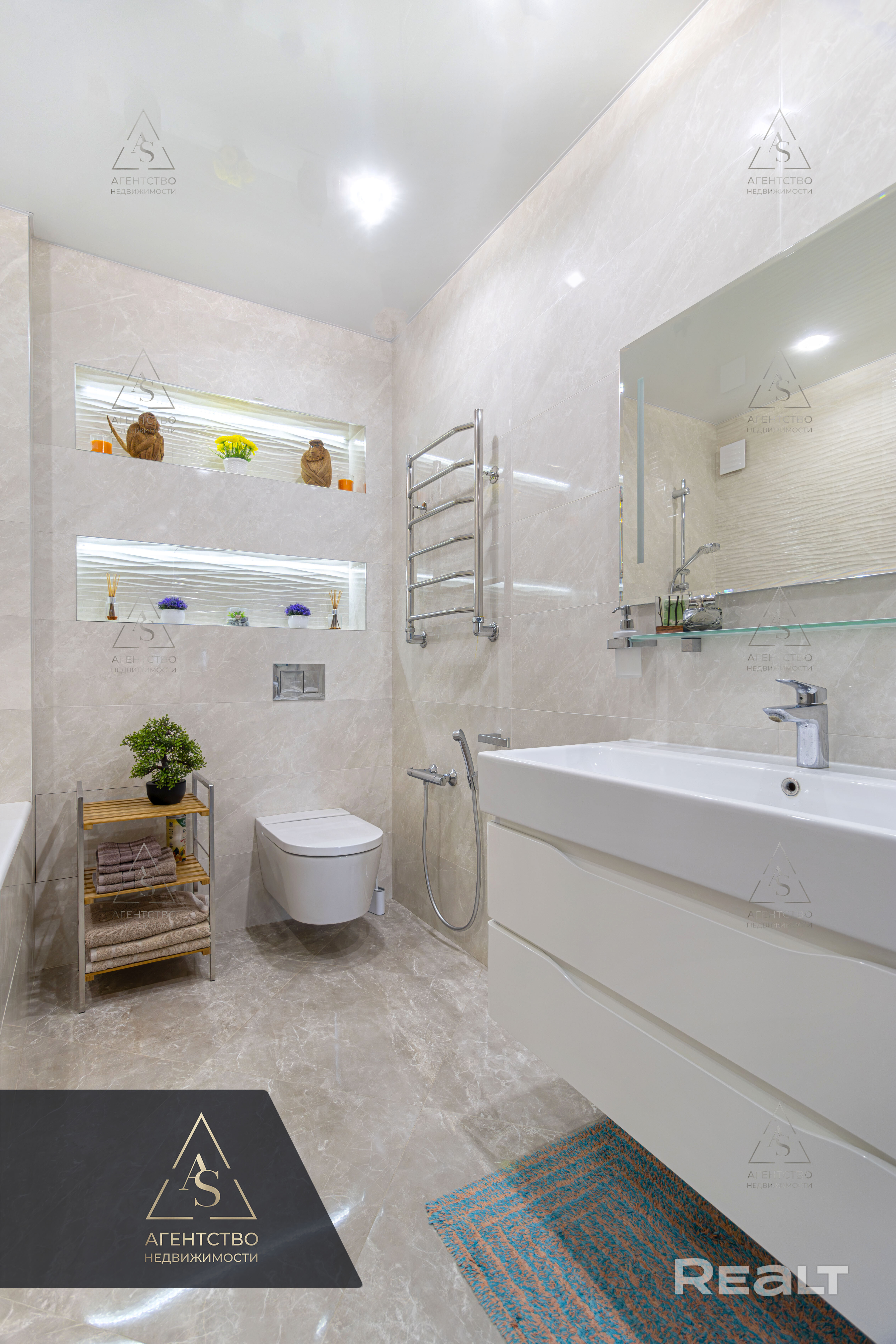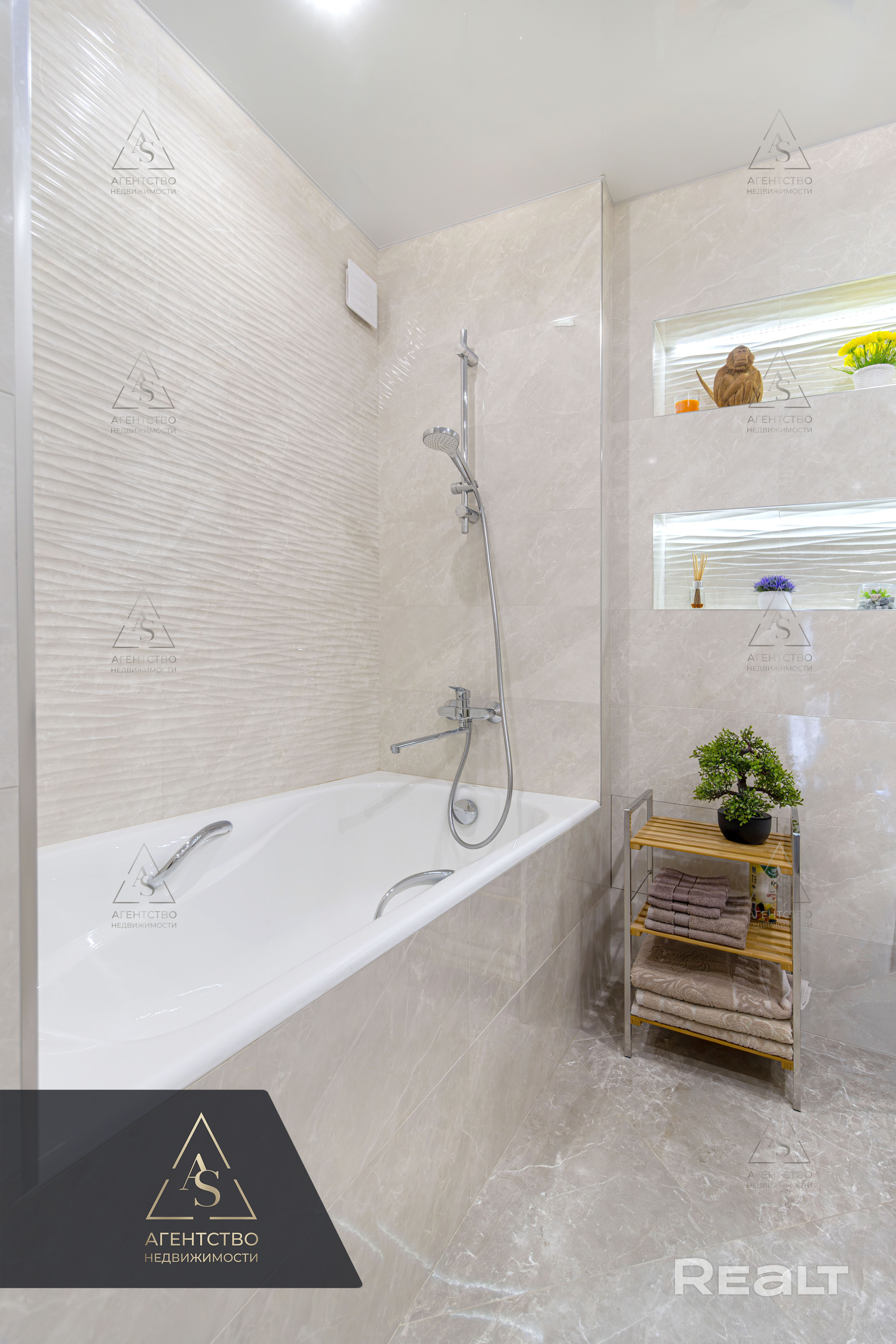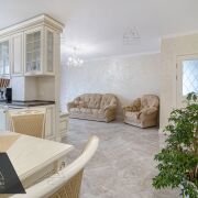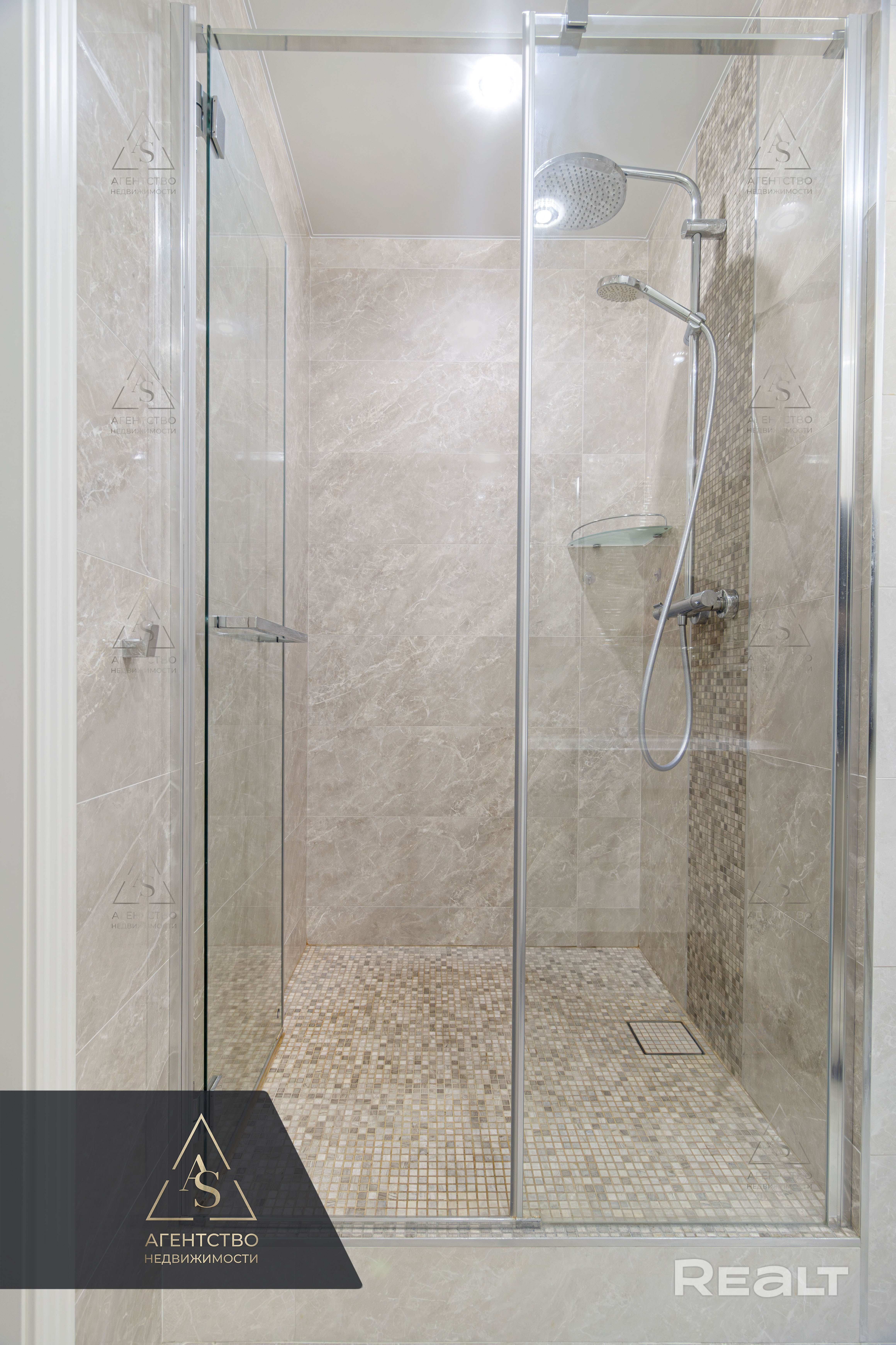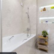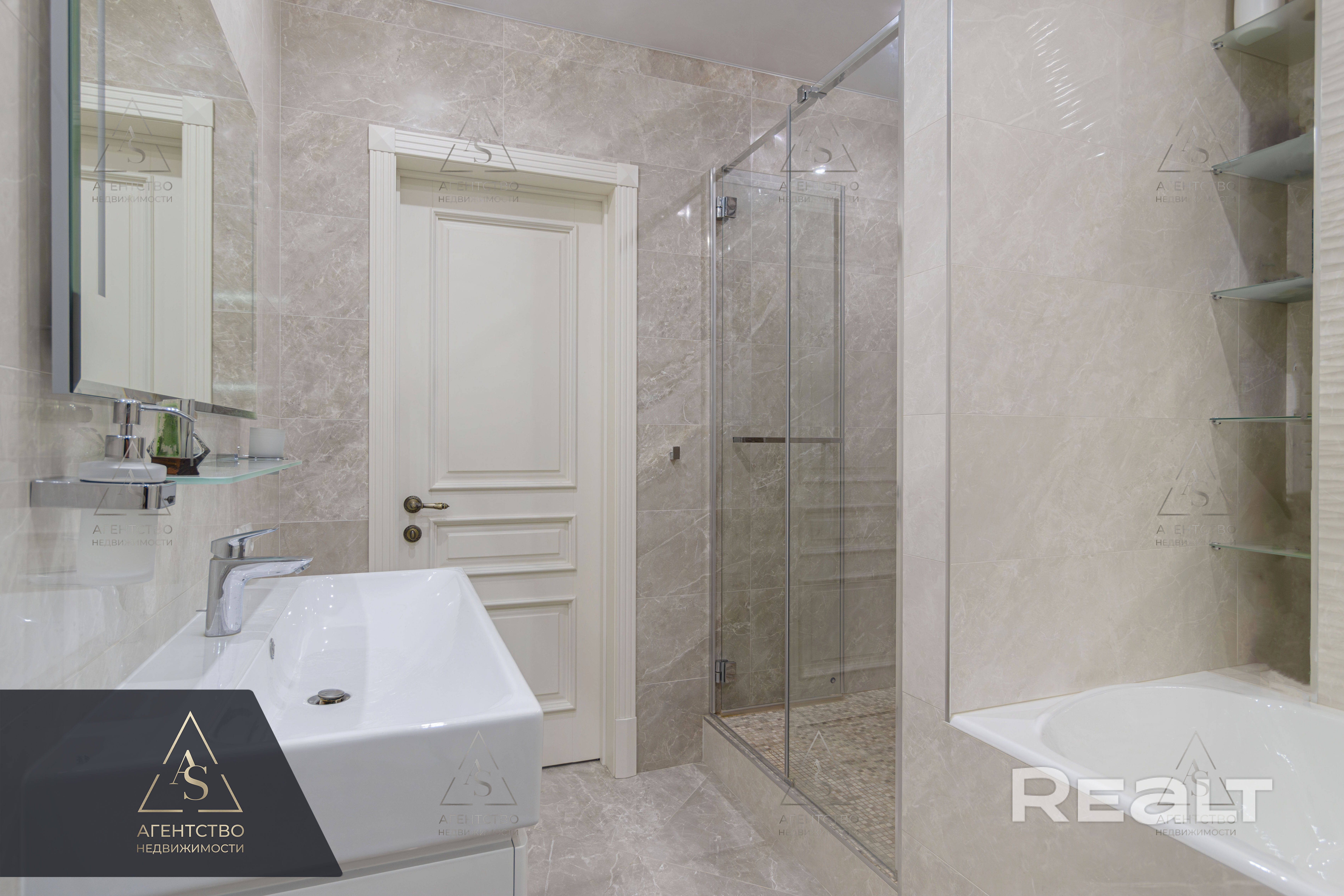 - Стены облицованы декоративной штукатуркой, а на полу уложен керамогранит. В санузле и гардеробной пол с подогревом, что делает их более комфортными для пользования. В санузле установлена инсталляция, а также гигиенический душ. Установлен бойлер на 50л. Вся ванная облицована Итальянской плиткой.