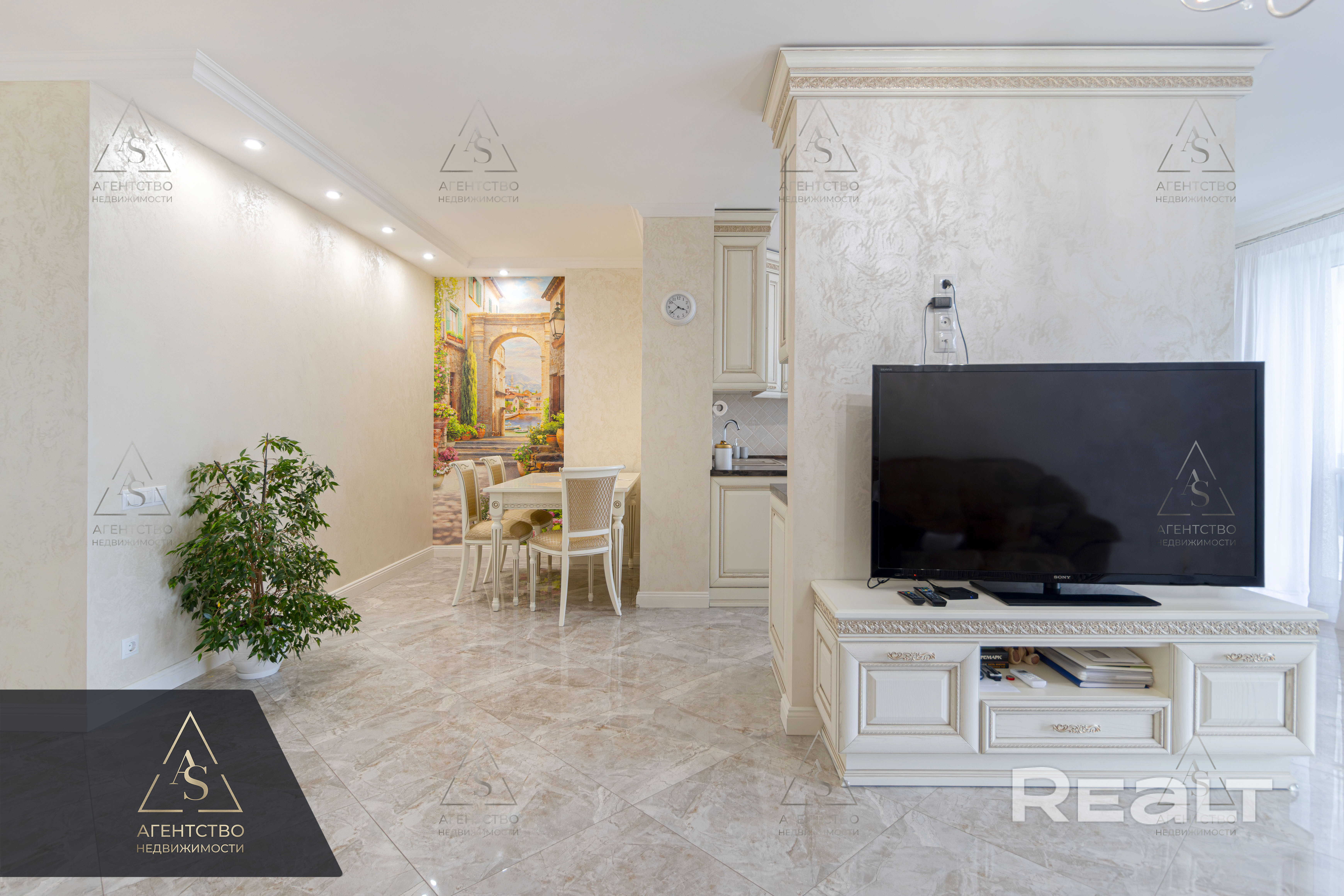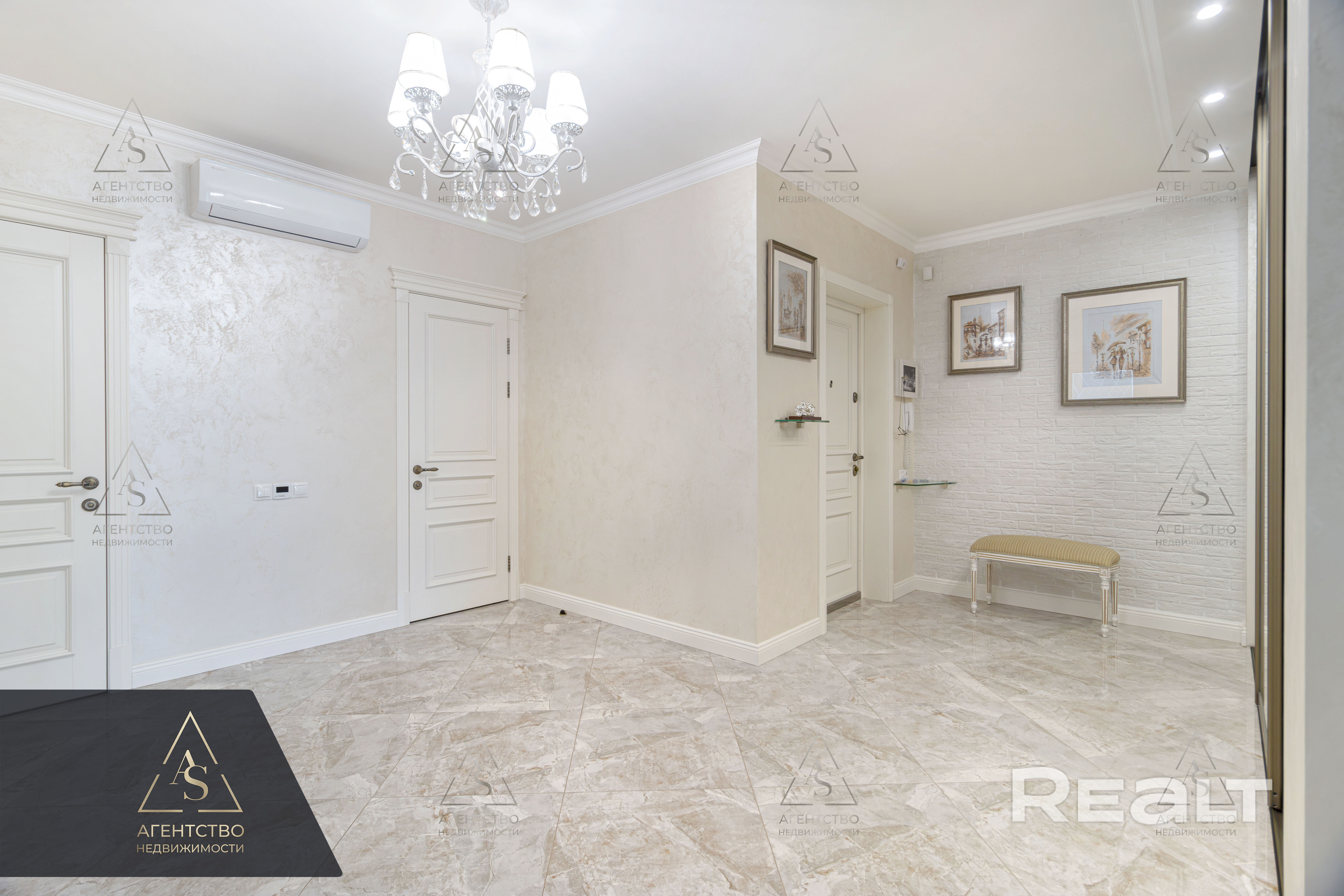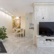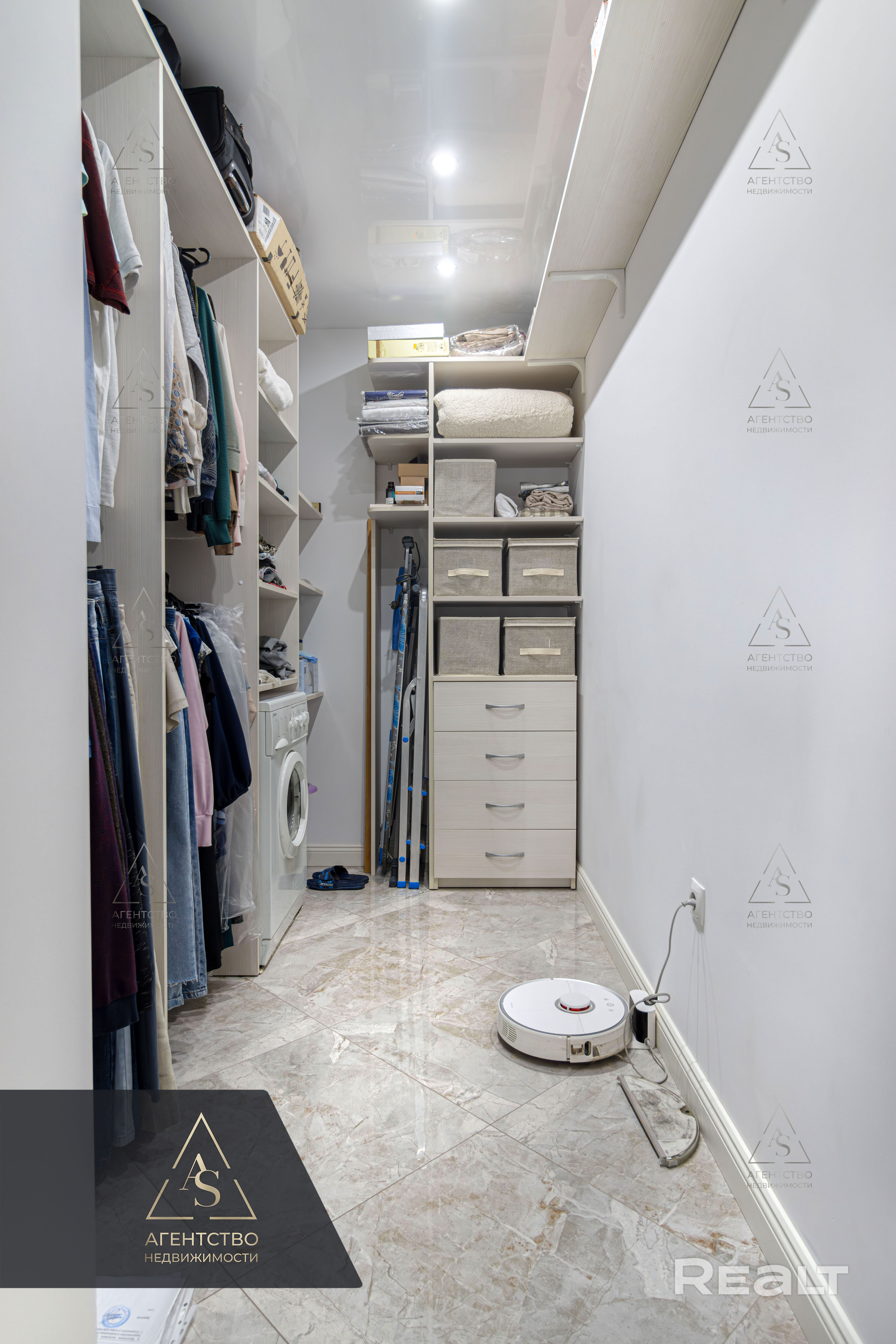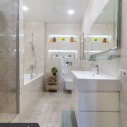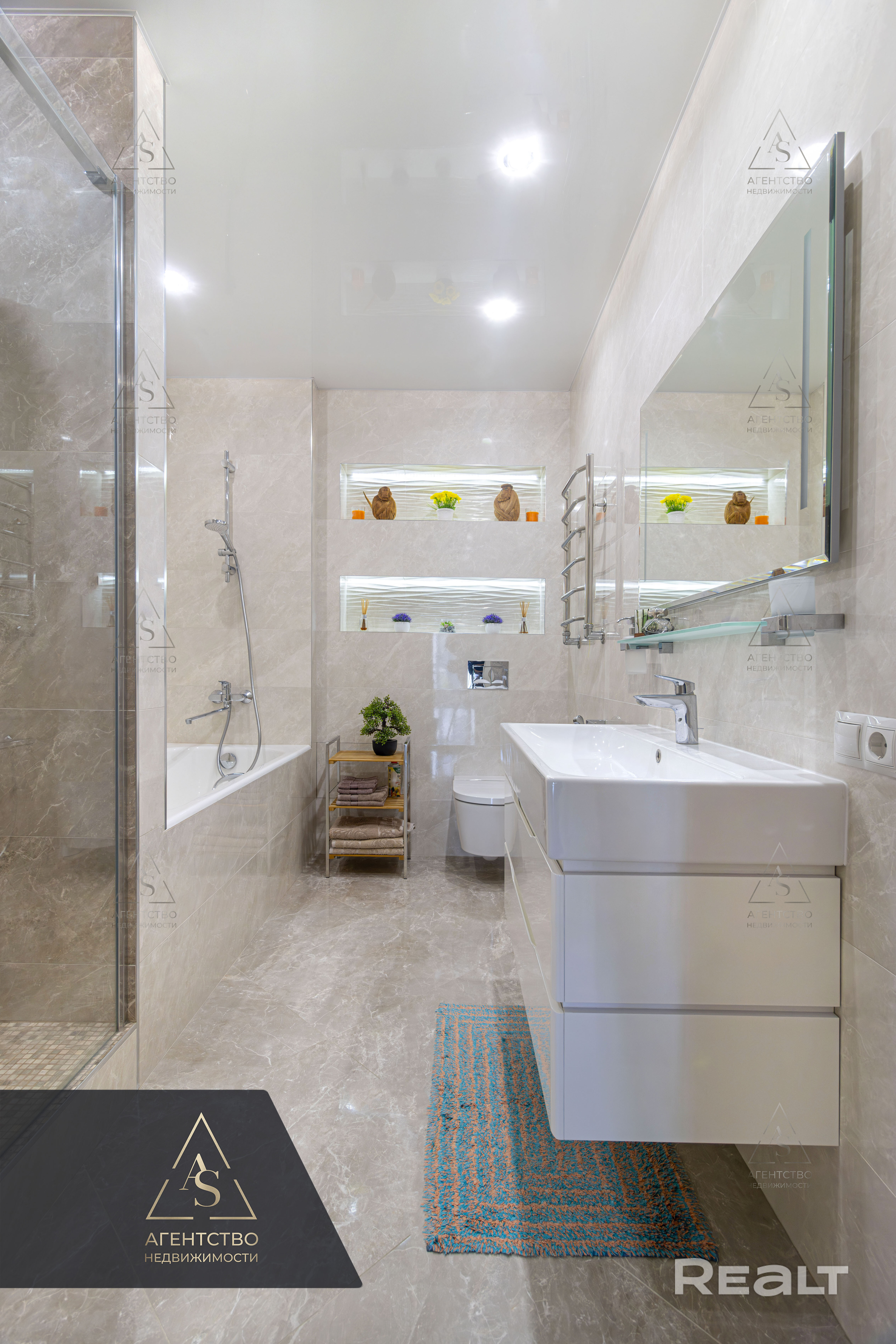 - Стены облицованы декоративной штукатуркой, а на полу уложен керамогранит. В санузле и гардеробной пол с подогревом, что делает их более комфортными для пользования. В санузле установлена инсталляция, а также гигиенический душ. Установлен бойлер на 50л. Вся ванная облицована Итальянской плиткой.