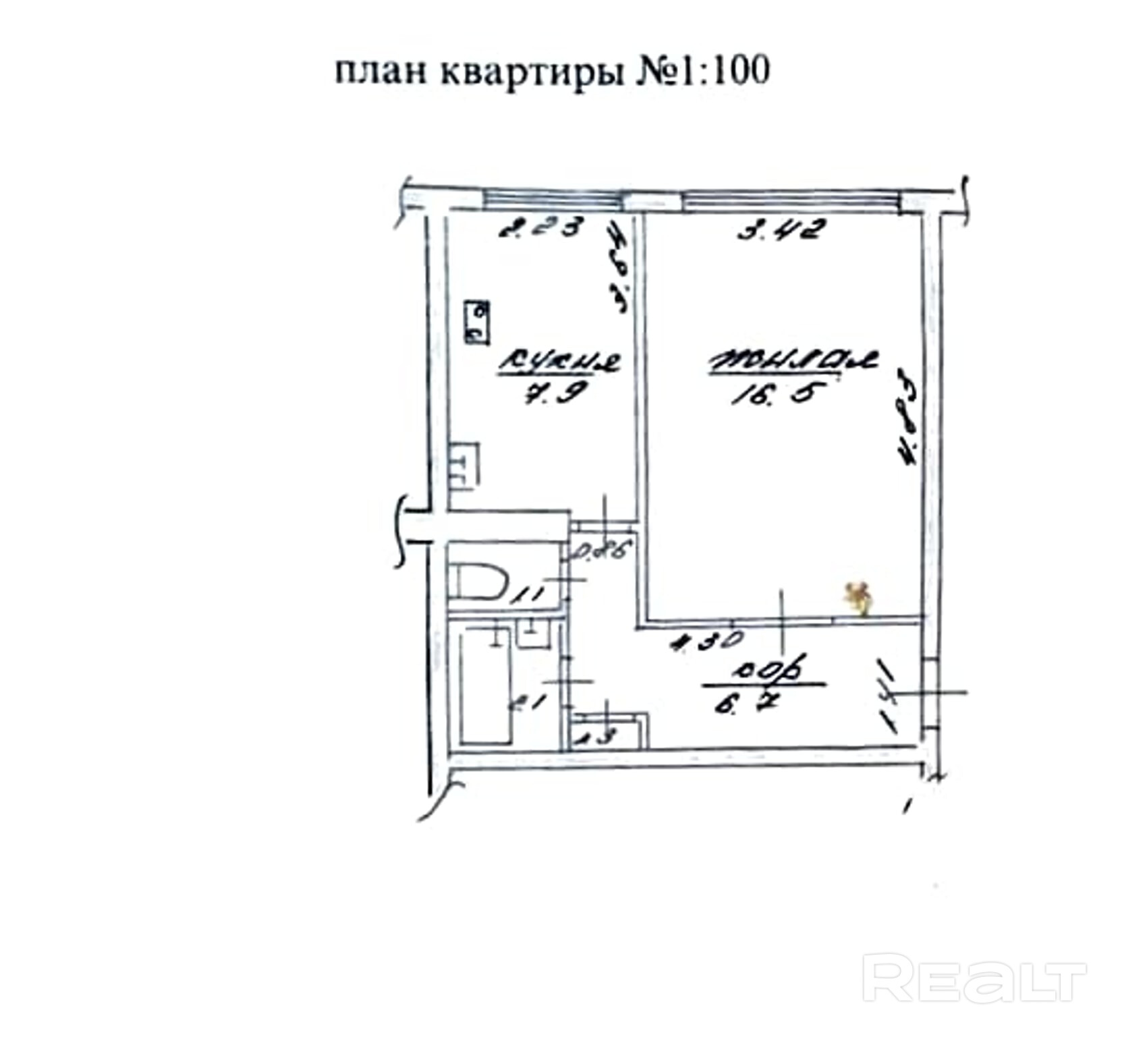 Общая площадь квартиры составляет 34,6 кв.м, из которых жилая площадь — 16,5 кв.м, а кухня — 7,9 кв.м. Входная дверь металлическая, межкомнатные — шпон. Установлены окна ПВХ. Пол — паркет, линолеум и плитка. Санузел раздельный.