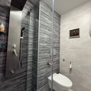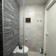 Ванная комната в плитке, всё аккуратно и ухоженно.
