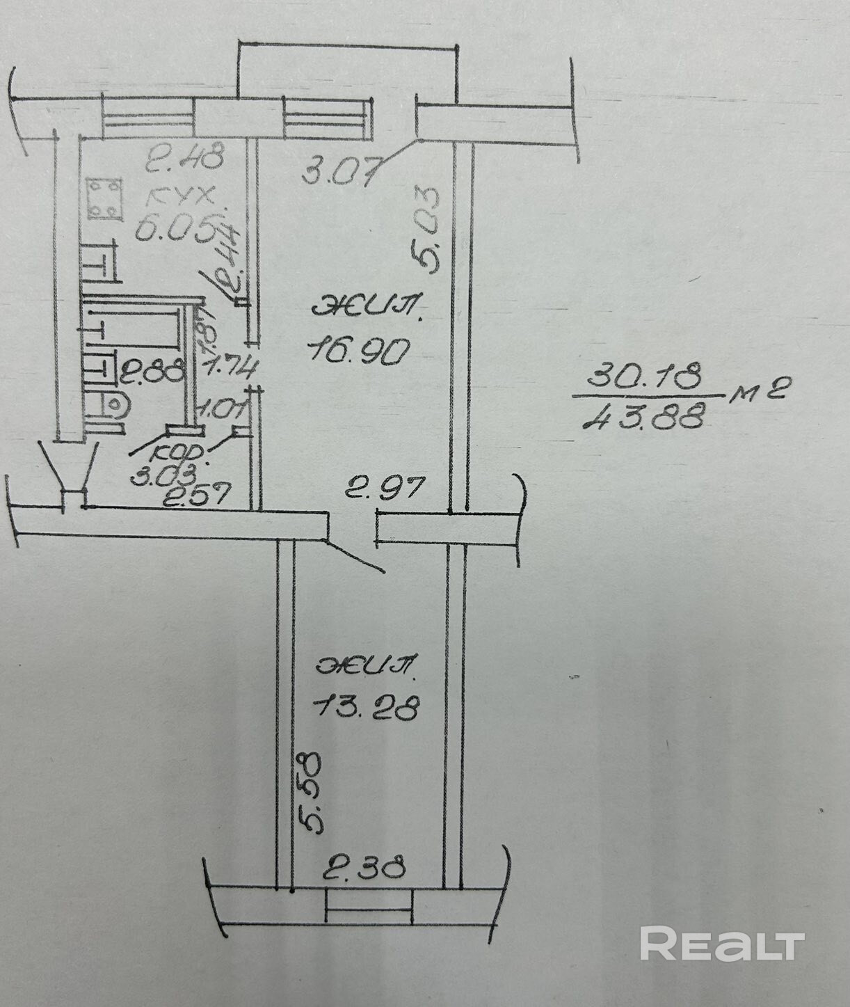 Общая площадь 43,88 (по СНБ 44.52) кв.м.