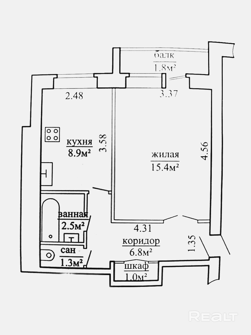 Квартира теплая, сухая, расположена на 1-ом этаже 5-этажного кирпичного дома общей площадью 35,9 кв.м., жилая 15,4 кв.м., кухня 8,9 кв.м., ванная комната - 2,5 кв.м., санузел - 1,3 кв.м. В прихожей (6,8 кв.м) расположен удобный встроенный шкаф (1кв.м).
