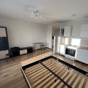 Продаётся однокомнатная квартира-студия на 10-м этаже с красивым открывающимся видом. Общая площадь - 30,6 квадратов, из них 22 - жилая. Кирпичный дом с утеплённым фасадом. Лоджия с панорамным остеклением. В квартире сделан хороший ремонт, установлены новые белые двери. Ванная комната совмещенная с санузлом, новая сантехника (ванная, санузел, стиральная машина, раковина), уложена красивая жемчужная плитка. Белая кухня с газовой плитой, кровать, стенка. Качественный ламинат.