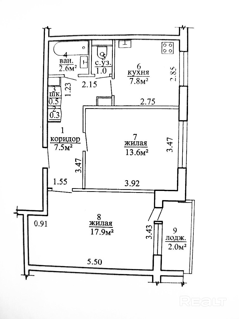 Квартира не угловая, общей площадью 51,2 кв.м (+ 2 кв.м. застеклённая лоджия). Включает: площадь жилых комнат - 17,9 кв.м. и 13,6 кв.м., прихожая - 7,5 кв.м. (+0,8 кв.м. встроенный шкафы), кухня - 7,8 кв.м., ванная комната - 2,6 кв.м., санузел - 1,0 кв.м. (см.фото тех. паспорта).
