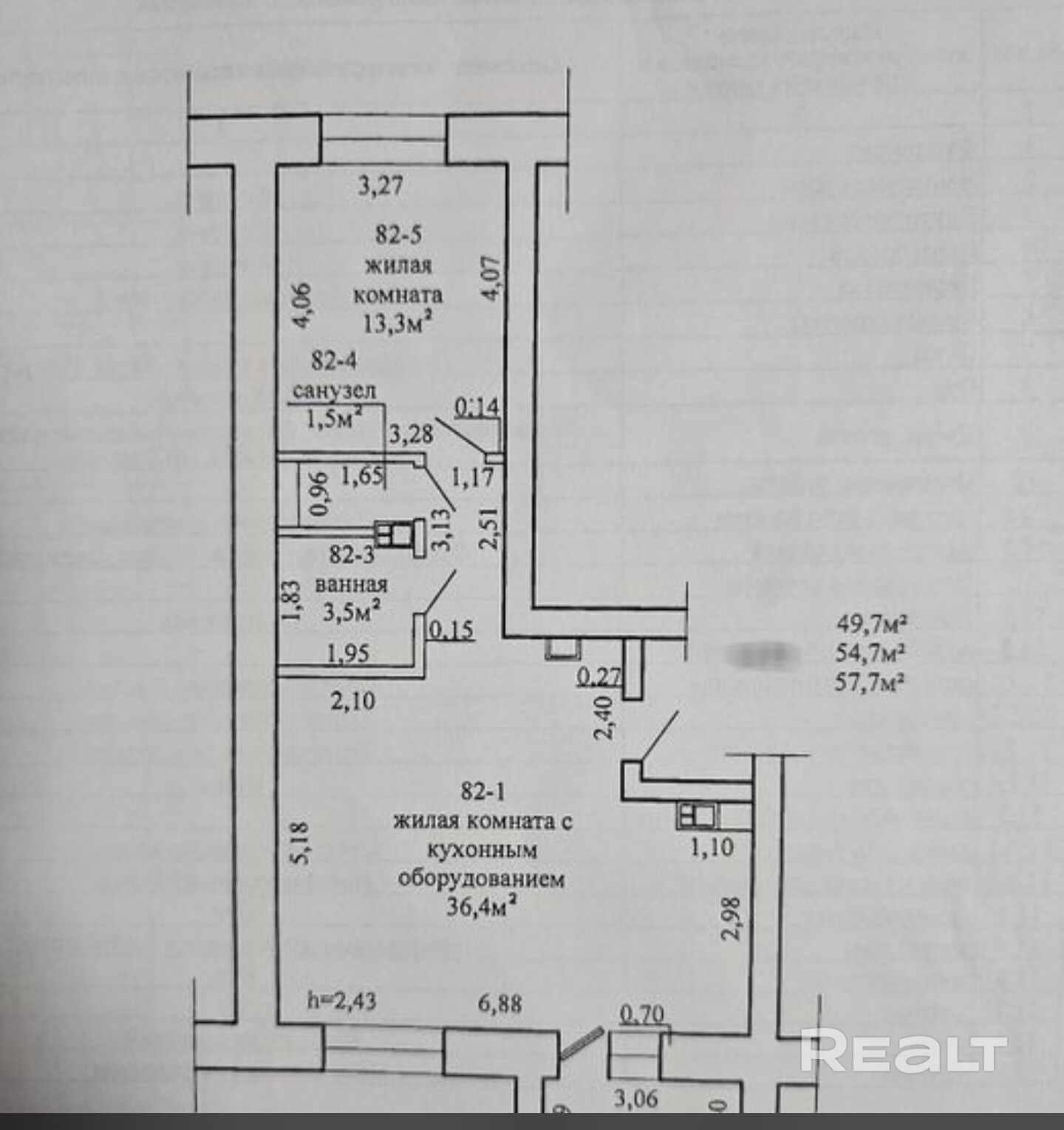 -общая площадь 54,7 кв.м., -площадь по СНБ -57,7 кв.м.,
