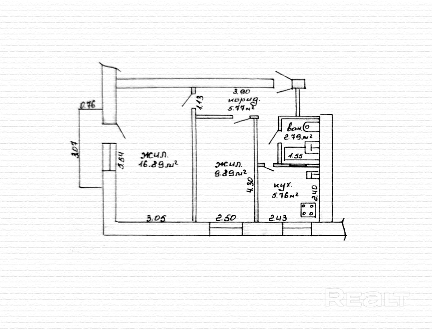 - Площадь: общая – 41,1 кв.м, жилая – 26,78 кв.м, кухня – 5,76 кв.м.