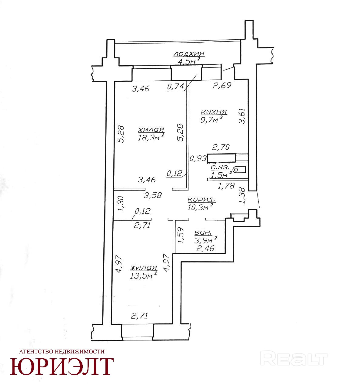 Общая площадь 61.7 м.кв. по СНБ, жилая 31.8 м.кв., кухня 9.7 м.кв.