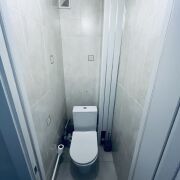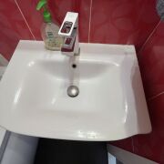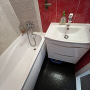 Комфортный санузел: стены выложены кафелем, рабочая сантехника, трубы заменены на полипропилен, акриловая ванна, удобной формы умывальник, зеркало, полочки, мебель - все есть.